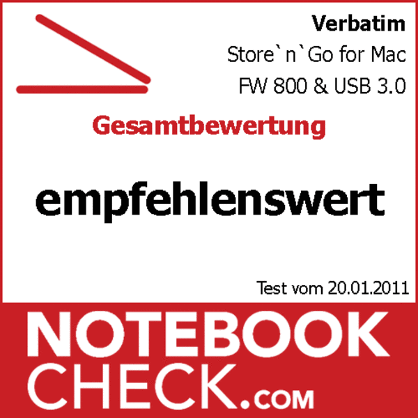 Die Verbatim Store`n`go for Mac mit FW 800 und USB 3.0 Schnittstelle bietet unter dem jeweiligen Betriebssystem immer die optimale Anbindung. Für Mac User ist vielleicht die etwas abfallende Schreibleistung mit Firewire 800 eine kleine Einschränkung, ansonsten können wir der Verbatim Store`n`go mit 500 GB Kapazität nur gute Noten ausstellen. Das Gehäuse ist stabil und ordentlich verarbeitet, die zusätzliche Stromversorgung sorgt für eine zuverlässige Nutzbarkeit und der Preis ist angesichts der Schnittstellen mit 90,- Euro noch angemessen.