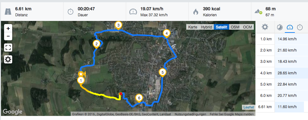 Das GPS-Modul des Vernee Mars findet im Freien zuverlässig, aber langsam die aktuelle Position bei einer Genauigkeit von etwa 3 Metern. In Gebäuden gelang die Positionsbestimmung im Test nicht. Um die Ortungsgenauigkeit unseres Testgerätes in der Praxis einschätzen zu können, zeichnen wir parallel eine Strecke zu Vergleichszwecken mit dem GPS-Fahrradcomputer Garmin Edge 500 und dem Smartphone auf. Am Ende der gut 6 Kilometer langen Strecke liegen knapp 280 Meter zwischen dem Mittelklasse-Smartphone und dem Profigerät aufgrund der Aufsummierung kleiner Abweichungen des Vernee Mars - die Genauigkeit des Smartphone-GPS-Modul ist insgesamt durchschnittlich.
