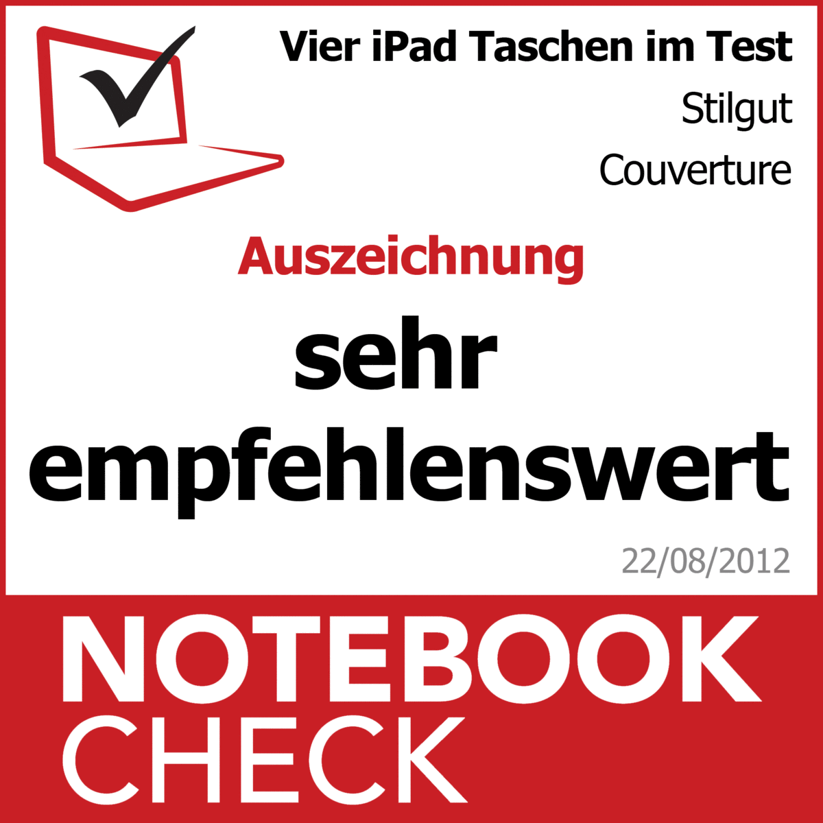 Preislich noch über den beiden vorhergehenden Lösungen positioniert sich die Berliner Firma Stilgut mit ihren Echtleder Taschen. Das Couverture stellt hier eine Mischung aus den beiden bereits beschriebenen Hüllen dar. So wird das iPad wie beim iGlaze in ein hier mit Leder bezogenes Hartkunststoffcase geklemmt, der Deckel zeigt allerdings dieselbe Balkenstruktur wie Apples Smart Case, sprich kann zu einem dreieckigen Prisma zusammengerollt werden und ermöglicht auf diese Weise zwei verschiedene Stellwinkel (12 und 73°). Öffnet man den Deckel, geht auch hier das iPad problemlos aus dem Standby an.