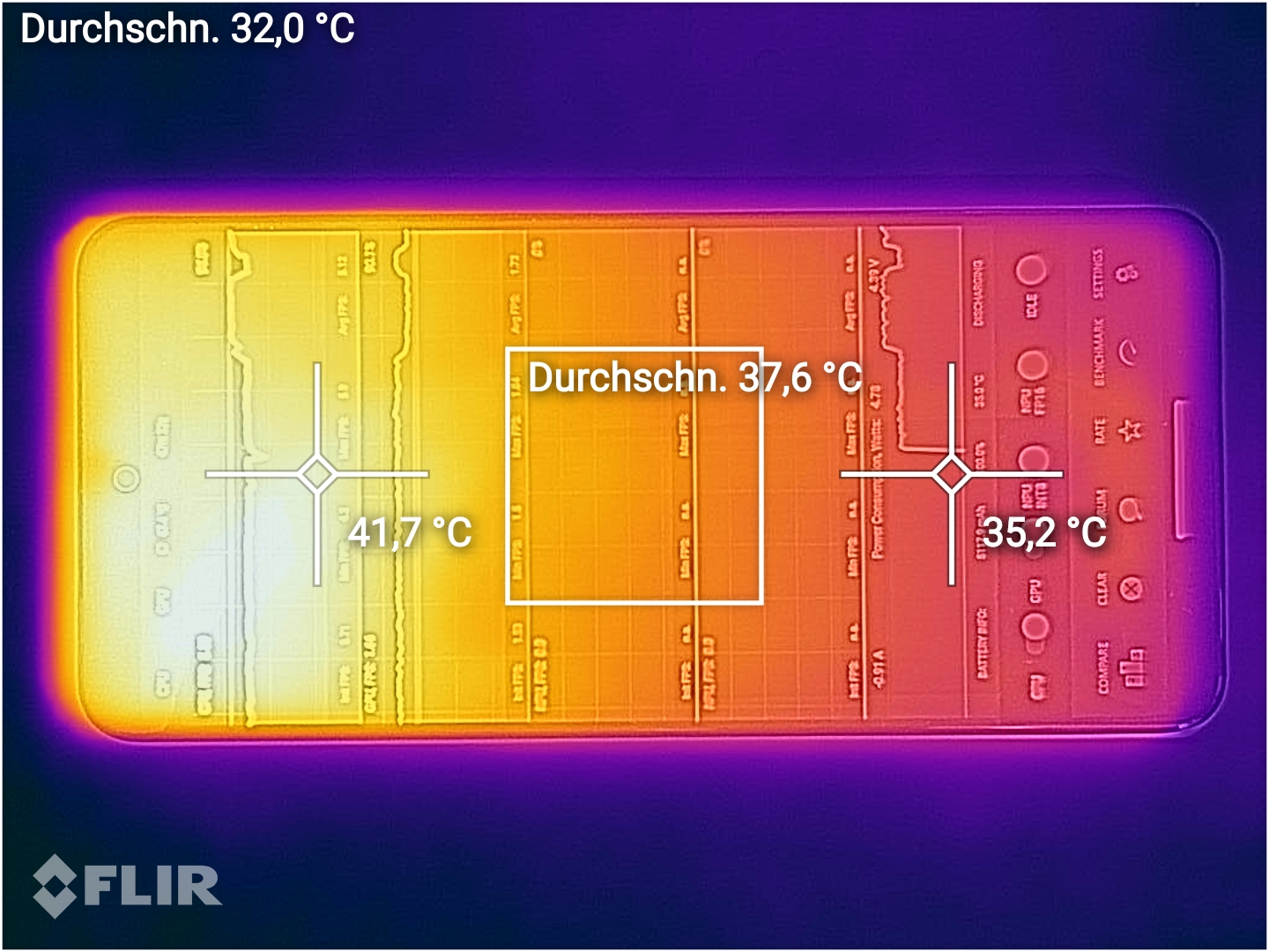 Die Oberflächentemperaturen steigen unter andauernder Last nur in Teilen der Vorderseite über 40 °C. Die Leistung des Einsteiger-SoCs wird auch im Stresstest zu keiner Zeit beeinträchtigt.