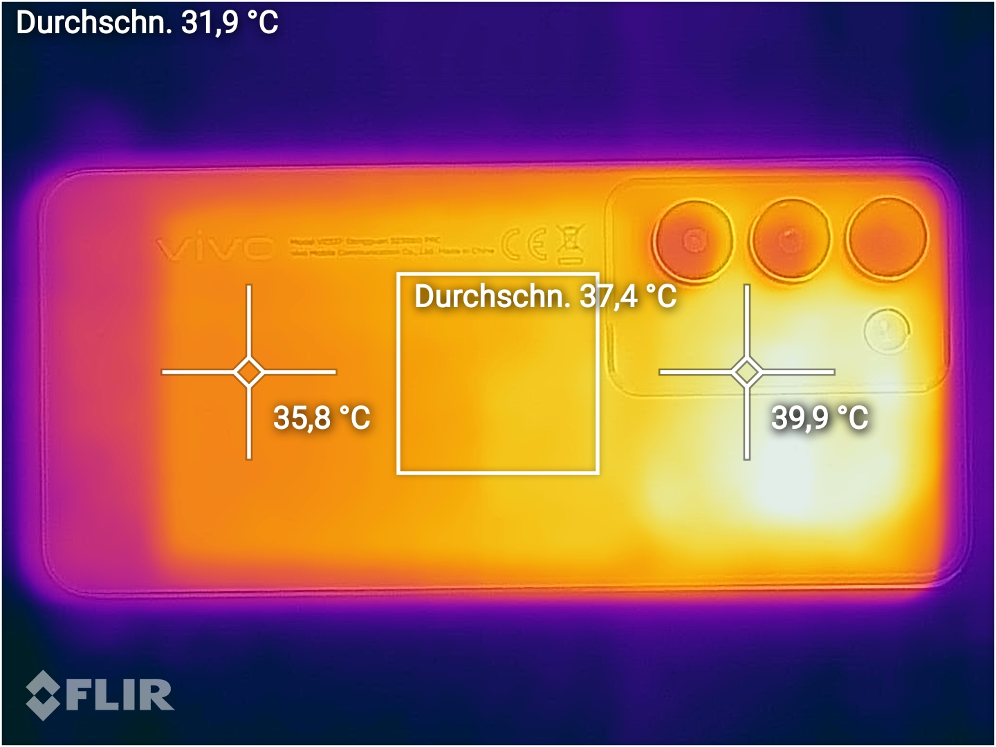 (+) Auf der Unterseite messen wir eine maximalen Wert von 39.7 °C (im Vergleich zum Durchschnitt von 34 °C).