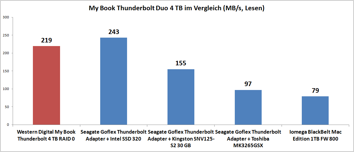 Das was jedoch richtig weh tut, sind die hohen Preise, die man derzeit für Thunderbolt-Peripherie, und so auch für die My Book Thunderbolt Duo, aufbringen muss. Seitdem es neuerdings auch noch USB 3.0 auf Mac-Geräten gibt, werden es Festplatten wie das Testmodell, erst recht schwer haben.