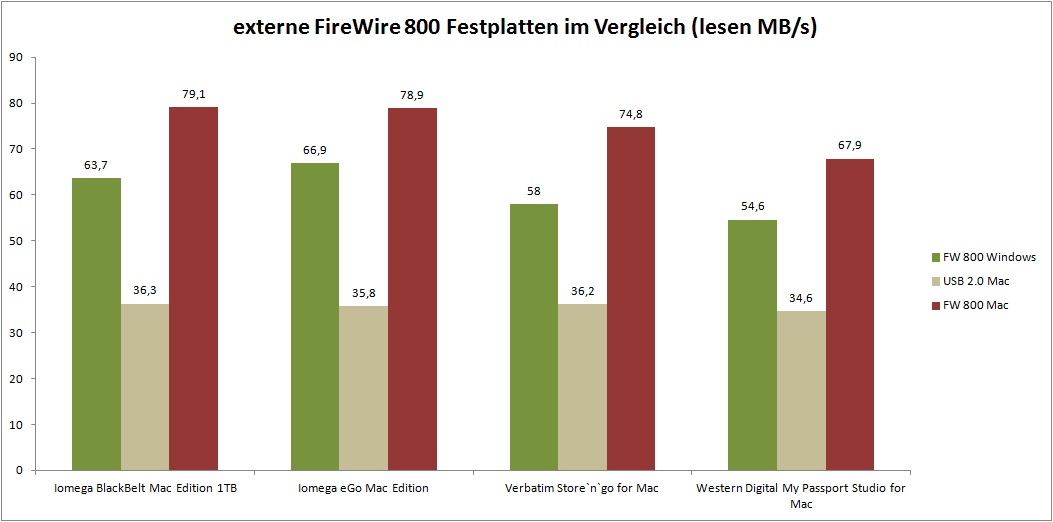 Die erzielten Geschwindigkeiten am Mac liegen mit maximal 67,9 MB/s (lesen) und 60,3 MB/s (Schreiben) etwa 10 MB/s unter den Ergebnissen unserer bisherigen Testkandidaten. An dem verwendeten Festplattenmodell kann das nicht liegen, da hier Transferraten von über 80 MB/s im Maximum möglich sein sollten. Vermutlich ist diese reduzierte Leistungsfähigkeit dem verbauten FireWire-Controller der WD My Passport Studio anzulasten, der die Leistungsfähigkeit etwas limitiert. Die Resultate die wir am USB-Port des MacMini ermitteln konnten, bewegen sich mit 34,64 MB/s (Lesen) und 32,7 MB/s (Schreiben) hingegen wieder im üblichen Rahmen und lassen keine Besonderheiten erkennen.