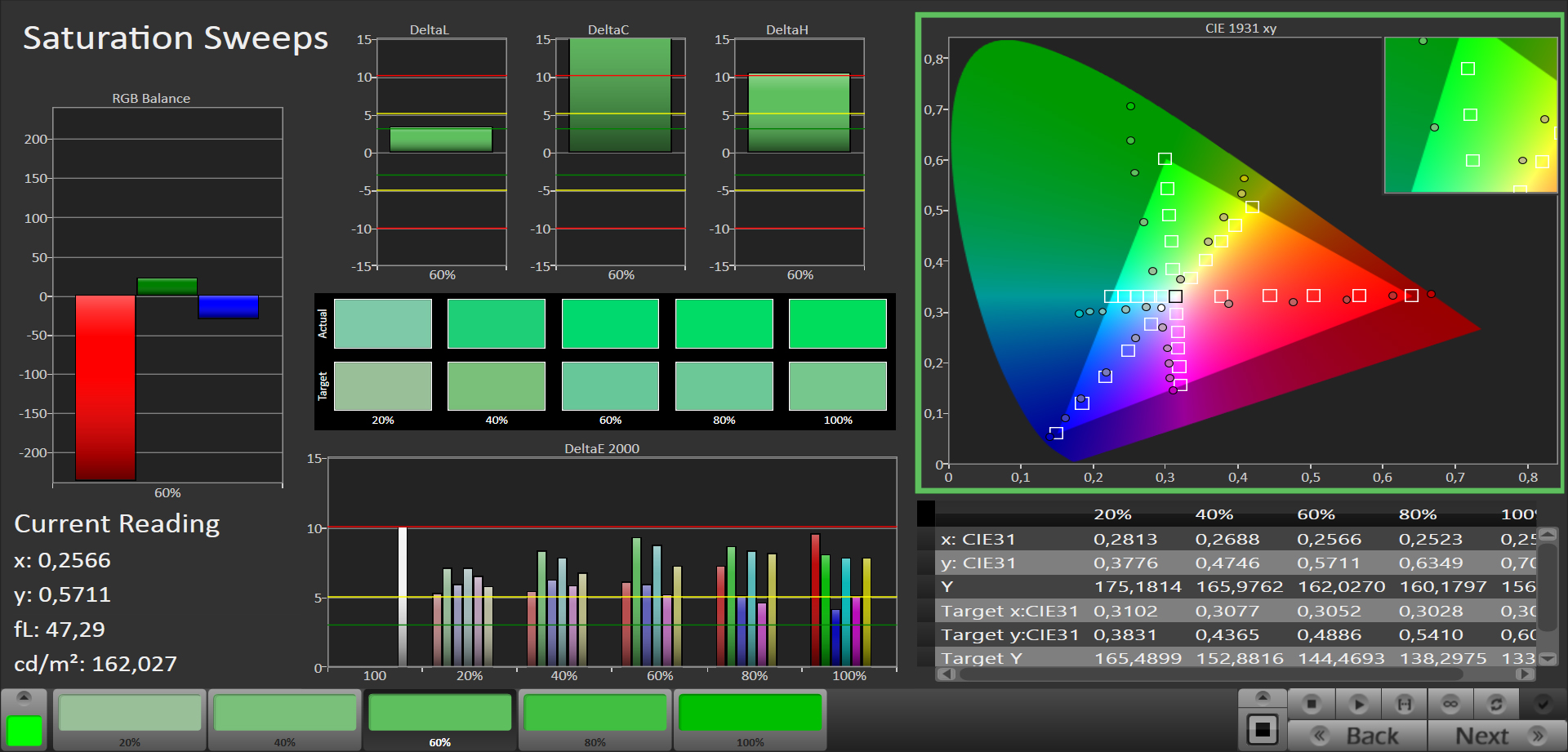 Bei der Farbgenauigkeit krankt es ein wenig an der Übersättigung der dargestellten Farben, wie es oft bei OLED-Panels der Fall ist. Außerdem zeigen die Graustufen einen sichtbaren Blaustich bei hellen Tönen. Smartphones wie das Lumia 830 demonstrieren, dass es auch in dieser Preisklasse möglich ist, Farben natürlich darzustellen. Fans von OLEDs wird dies jedoch nicht stören. Außerdem ist es möglich, in den Display-Einstellungen (MiraVision) zwischen zwei verschiedenen Farbprofilen zu wählen oder die Einstellungen manuell anzupassen. So kann auch der Übersättigung entgegengewirkt werden.
