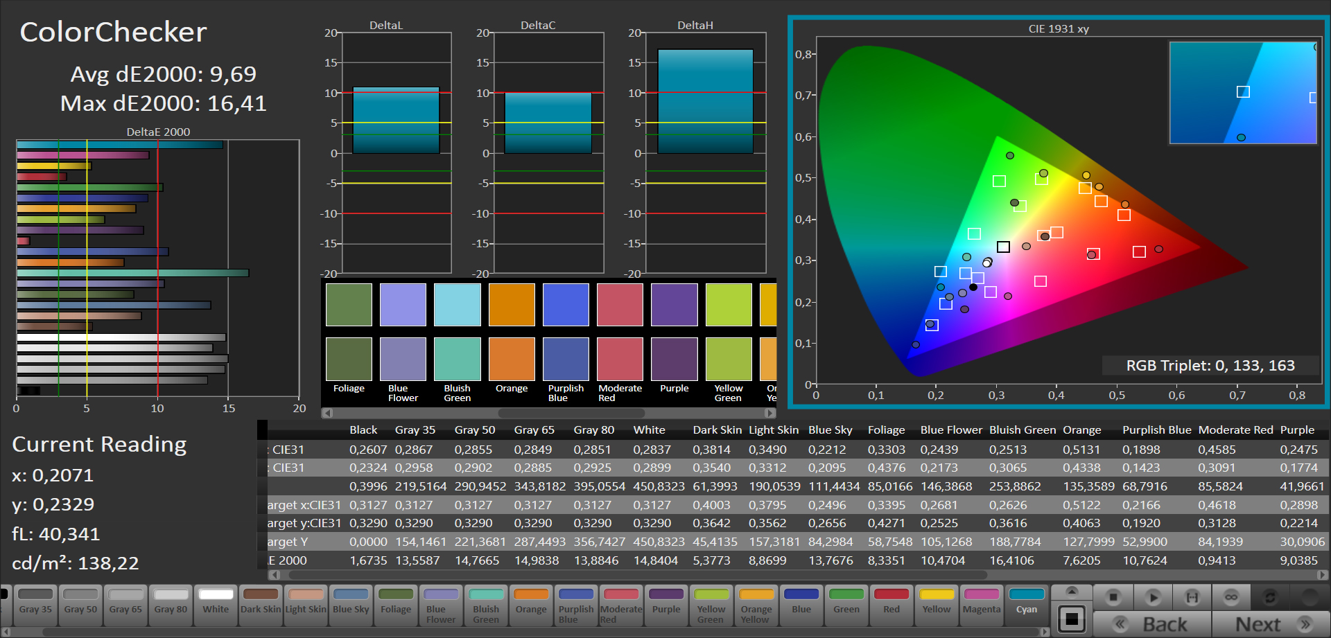 Genauere Messwerte zur Farbdarstellung liefert uns ein Spektralfotometer und die Software CalMan. Hier ergibt sich allerdings ein wesentlich weniger gutes Bild: Die Farbtemperatur ist deutlich zu hoch, die Farben werden also eher bläulich dargestellt. Das sieht man mit bloßem Auge bei den Graustufen. Gleichzeitig weichen die meisten Farbwerte viel zu stark vom Idealwert des Referenzfarbraums sRGB ab.