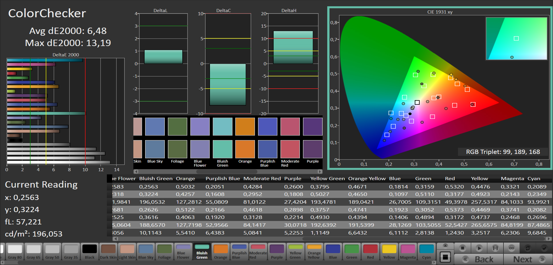 Die detaillierten Bildanalysen mit der Software CalMan und einem Spektralfotometer offenbaren deutliche Farbabweichungen vom sRGB-Normfarbraum mit einem DeltaE von 6,48. Gerade Grün-Gelb wird leicht verfälscht dargestellt. Dafür ist die Farbtemperatur mit 7.676 K nicht allzu weit von der Norm von 6.500 K entfernt, auch das Gamma von 2,26 ist gut gelungen. Den minimalen Blaustich sieht man besonders bei den Graustufen, hier auch schon im mittleren Verlaufsbereich.