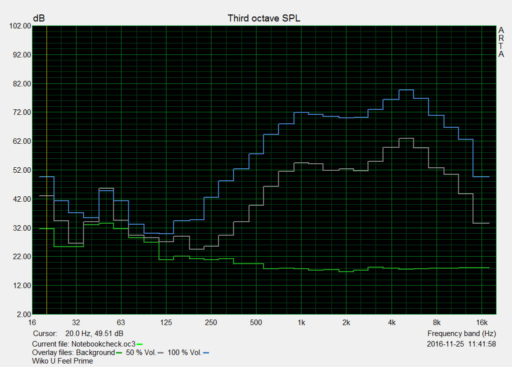 Mit über 85 dB(A) sind die Lautsprecher des Wiko U Feel Prime einigermaßen laut. Der Klang ist überraschend klar, auch sind die Höhen nicht so unangenehm präsent wie bei vielen anderen Smartphone-Lautsprechern. Bass ist natürlich kaum zu hören und für audiophile Naturen wird der Klang nicht ausreichen. Um gelegentlich ein YouTube-Video anzuschauen oder ein Musikstück anzuhören, reicht er aber aus.