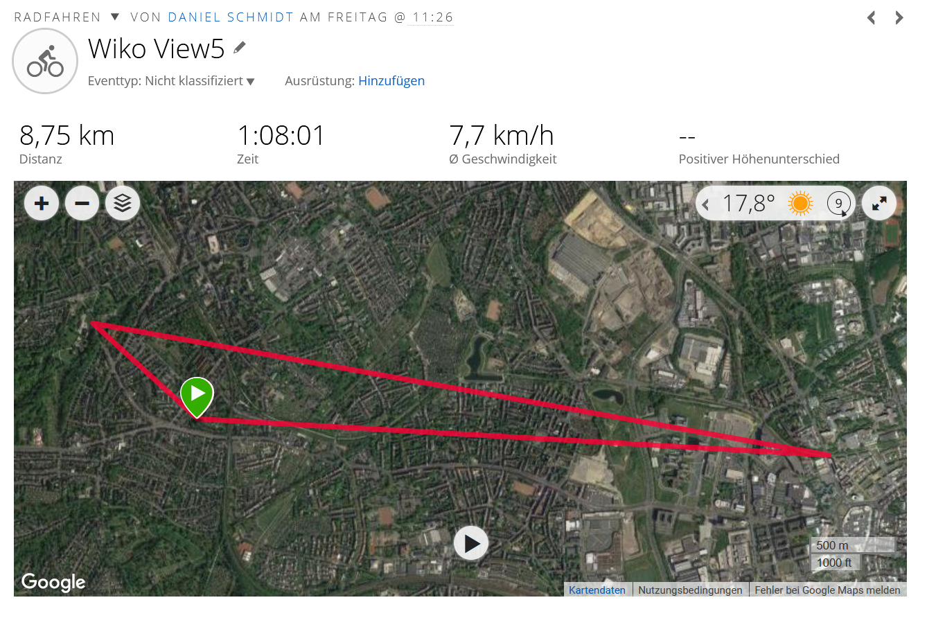 Um die Ortungsgenauigkeit unseres Testgerätes in der Praxis einschätzen zu können, zeichnen wir parallel eine Strecke zu Vergleichszwecken mit dem GPS-Fahrradcomputer Garmin Edge 500 auf. Da während des Tests Probleme bei der Aufzeichnung aufgetreten sind - obwohl alle Energiesparfunktionen deaktiviert waren - sind die Abweichungen des GPS-Moduls für das View 5 aber nicht im Detail verfügbar.