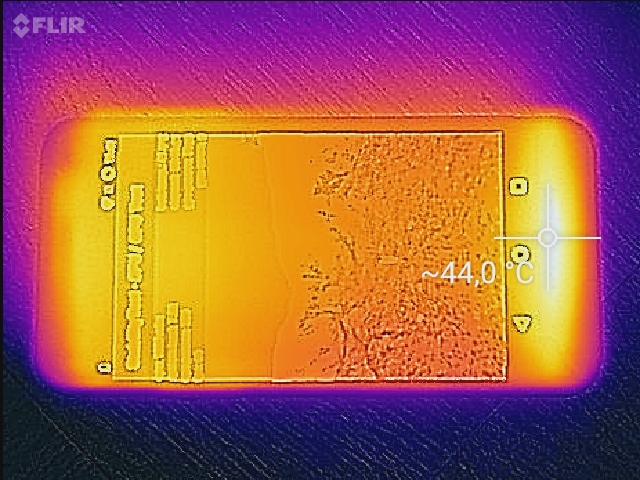 Mit Idle-Betriebstemperaturen von bis zu 39,7 °C im Bereich der Navigationsleiste erwärmt sich das Wileyfox Spark+ bereits bei geringer Beanspruchung punktuell etwas stärker. Unter Dauerlast steigen die Werte dann großflächig über die 40-°C-Marke, ohne dabei wirklich kritisch zu werden. Subjektiv fühlte sich das Gerät im Alltag nicht übermäßig warm an.