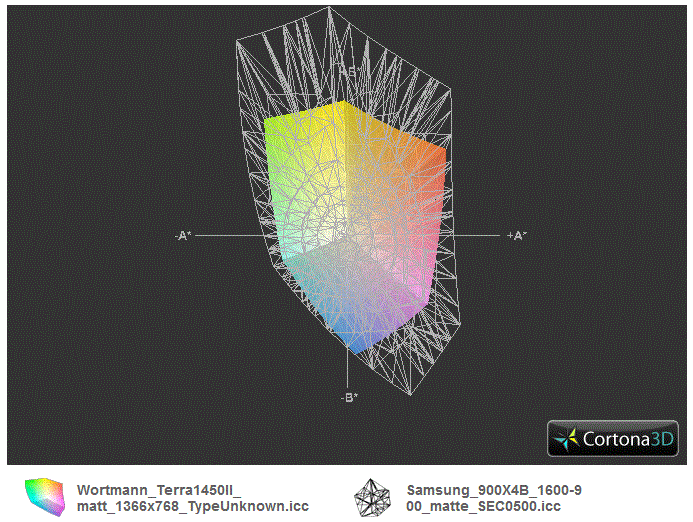 Der darstellbare Farbraum gilt als Kriterium, wenn professionelle Bildbearbeiter ihre Laptops auswählen. Schon aus Performance-Gründen und wegen der niedrigen Auflösung wird die Wahl nicht auf ein 1450 II fallen. Der Farbraum sei daher nur der Vollständigkeit halber genannt. Die ICC-Profile zeigen im Vergleich, dass selbst teurere Ultrabooks, wie das extrem leichte Toshiba Satellite Z930-119, ein ähnlich schlechtes Panel besitzen (Bild 3). Es gibt jedoch positive Ausnahmen, wie das Samsung 900X4B mit beinaher sRGB-Abdeckung (Bild 2).