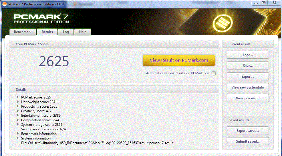 Warum das 1450 II trotz SSD eine solche niedrige Systemwertung bekommt, das erkennen wir deutlich am HDD-Score (5.177, PCMark Vantage) bzw. am Storage Score (2.861, PCMark 7). Andere SSD-Ultrabooks fahren bei Letzterem bis zu 83 % (Asus Zenbook Prime UX31A, ADATA XM11 SSD) oder zumindest 47 % mehr Punkte ein (Lenovo IdeaPad U410-MAH6MGE, HDD + SSD Cache). Weshalb die Verbatim SSD solch schlechte Performance abliefert, der klären wir unter Massenspeicher.