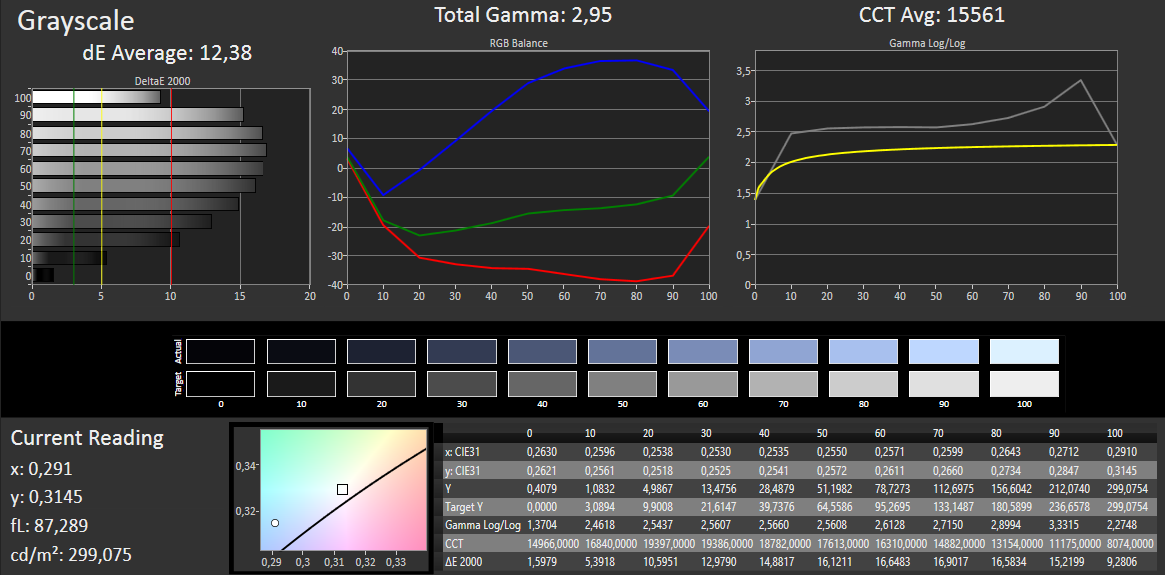 Mit dem Fotospektrometer haben wir die Anzeige im Auslieferungszustand vermessen. CalMAN zeigt einen eindeutigen Blaustich bei den Graustufen. Dieser setzt sich bei den Farben extrem fort, die meisten sind deutlich in blaue Bereiche verschoben. Die Konsequenz ist ein hoher DeltaE-Wert von 12. Durch eine Kalibrierung (z. B. X-Rite i1Pro 2) kann die Anzeige etwas vom überdeutlichen Blaustich befreit werden.