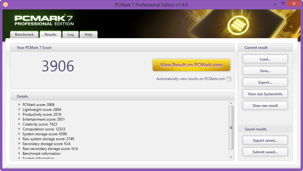 | PCMark 8 Home Score Accelerated | 2625 Punkte | |