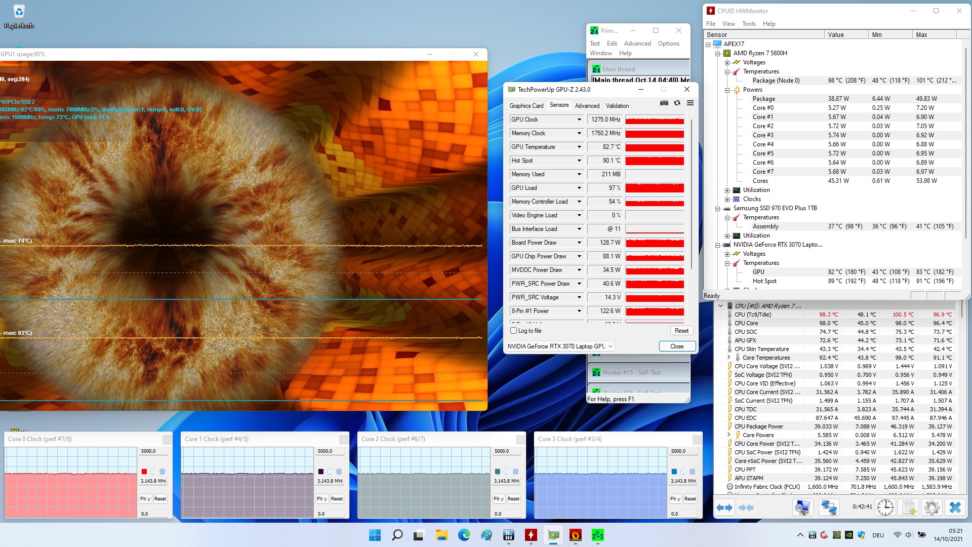 Die Temperaturentwicklung des Apex 17 orientiert sich trotz höherer Geräuschkulisse an der Konkurrenz. Nach einer Stunde Volllast mit den Tools Furmark und Prime95 konnten wir dem Chassis auf der Oberseite bis zu 45 °C und auf der Unterseite bis zu 49 °C entlocken. Im Inneren des Gehäuses erwärmt sich vor allem der Prozessor. Während die RTX 3070 beim Stresstest um die 83 °C erreichte, knackte der Ryzen 7 5800H laut dem Tool HWMonitor fast die 100-°C-Marke.