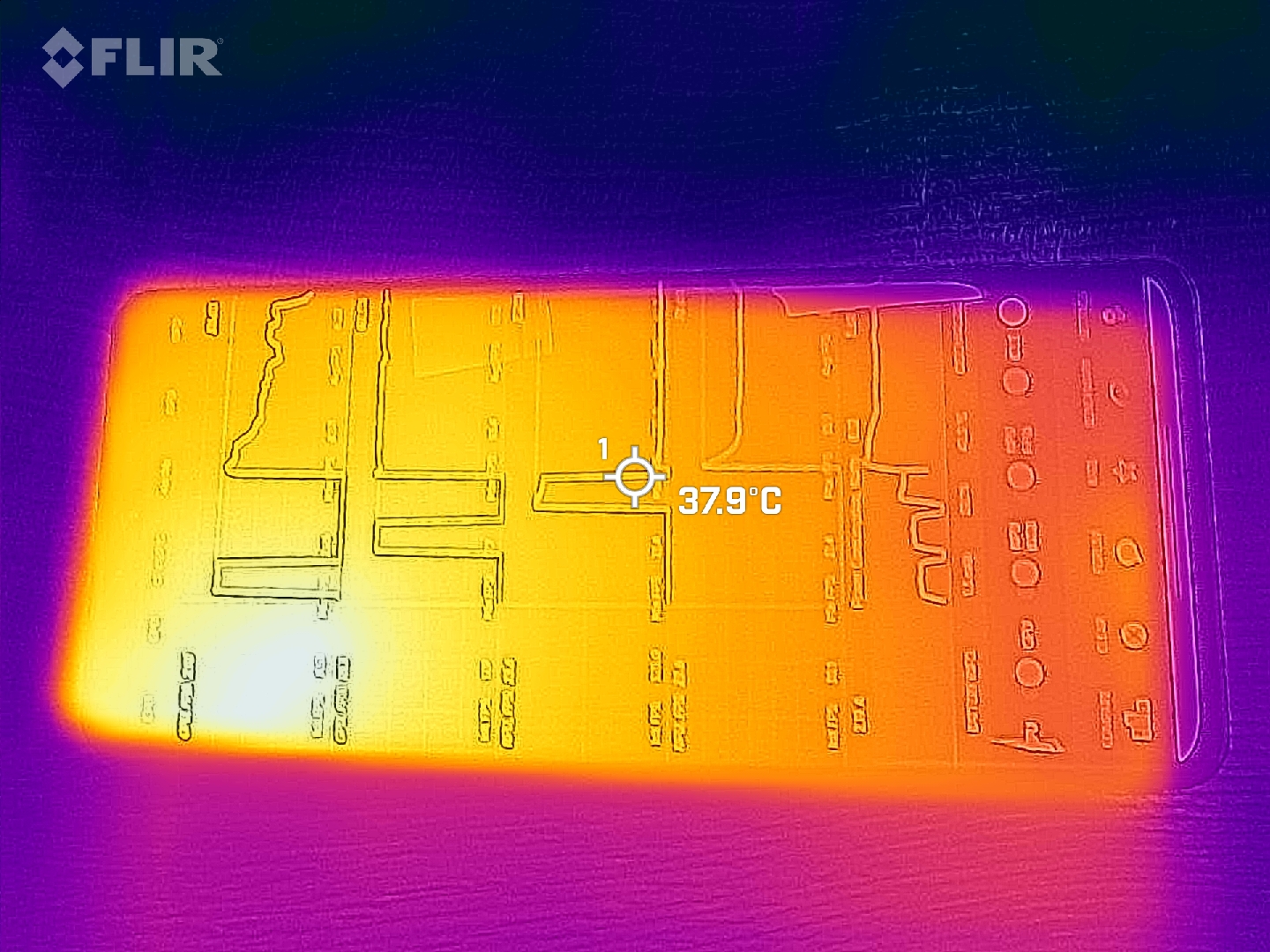 (±) Auf der Unterseite messen wir eine maximalen Wert von 40.3 °C (im Vergleich zum Durchschnitt von 34 °C).