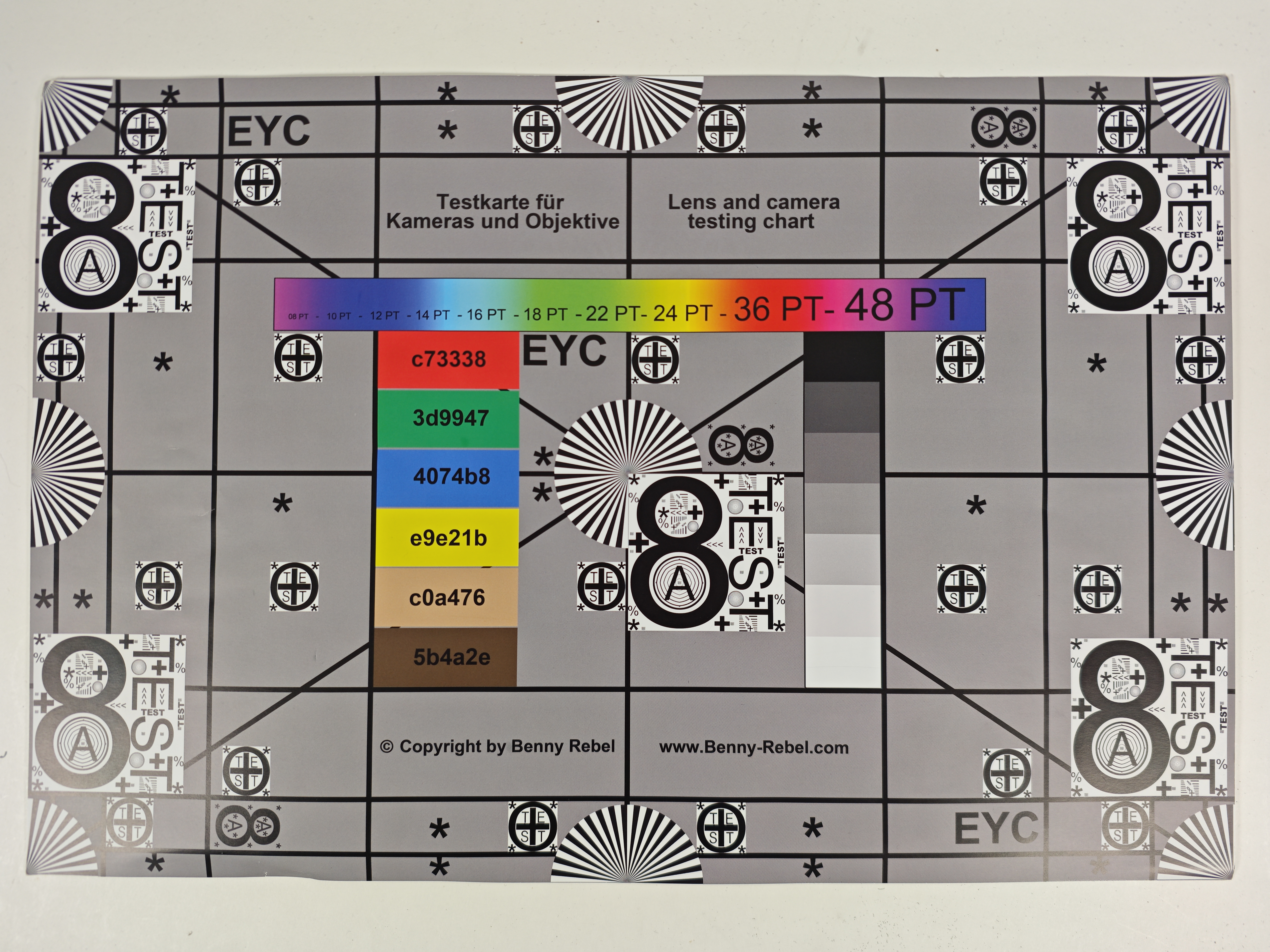 Tageslicht-Aufnahme 1Tageslicht-Aufnahme 2Ultraweitwinkel5-facher ZoomLowlight-AufnahmeUnter kontrollierten Lichtbedingungen zeigt die Hauptkamera eine sehr gute Abbildungsleistung. Die Farben der ColorChecker-Karte werden selbst bei 1 Lux Restlicht präzise eingefangen. Gleiches gilt für den Testchart, der vollständig erkennbar bleibt und immer noch viele Details zeigt.