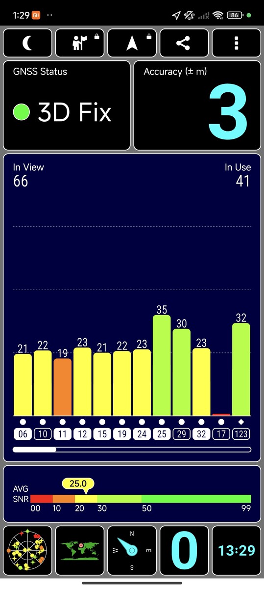 Zur Positionsbestimmung bedient sich das Xiaomi 14 bei den Satelliten-Navigationsdiensten GPS (L1, L5), Glonass (L1), Galileo (E1, E5a) und Beidou (B1(C), B2a), was meist im Dual-Band geschieht. Im Test kann es uns damit innerhalb von Gebäuden und im Freien auf jeweils 3 Meter genau lokalisieren.
