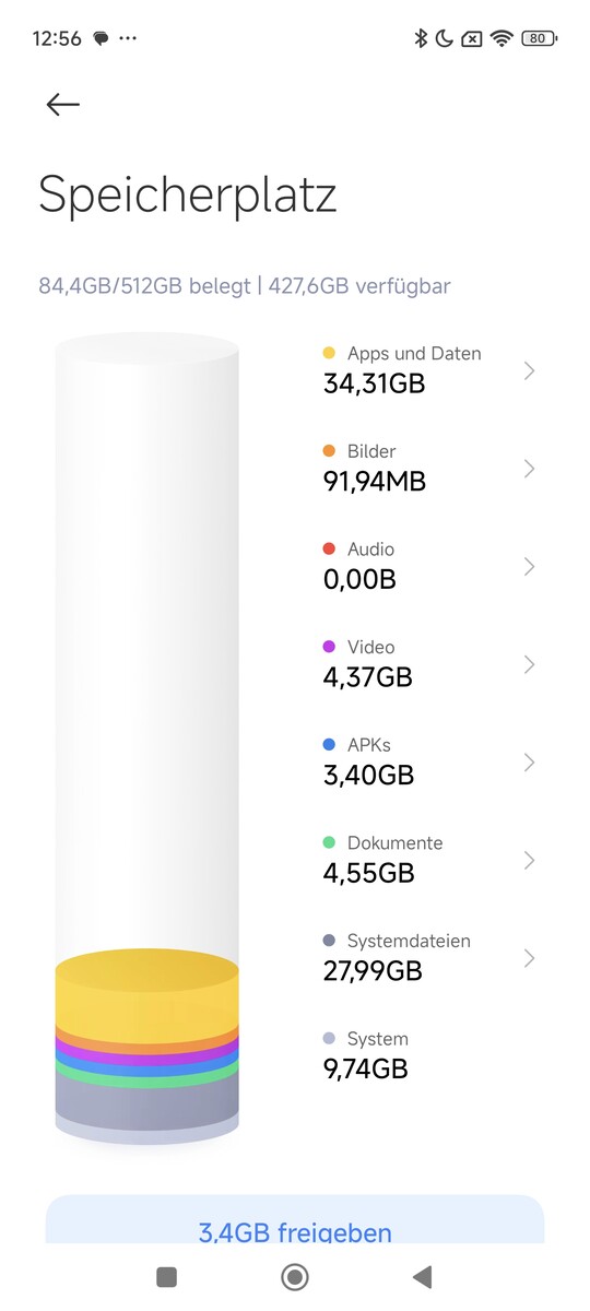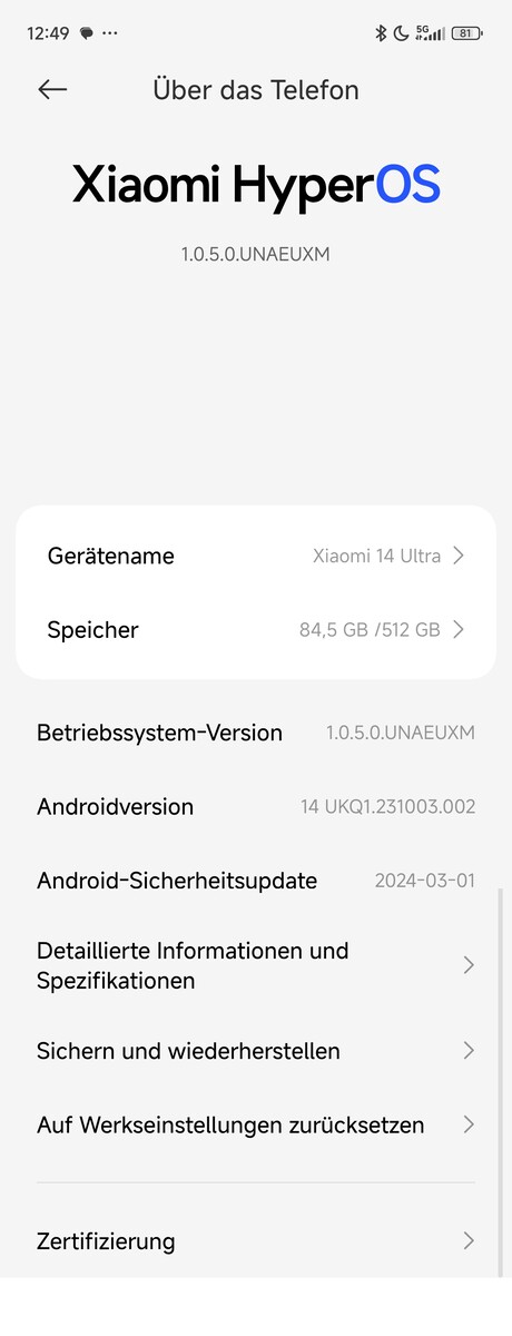 Das Xiaomi 14 Ultra kommt mit HyperOS 1.0, welches auf Android 14 basiert. Selbstverständlich sind auch die Google Dienste an Bord, und optisch unterscheidet sich das Betriebssystem kaum von der MIUI. Ein Vorteil ist die bessere geräteübergreifende Verbindung sowie ein schlankeres System, welches bei diesem Modell 9,74 GB groß ist. Werden die zusätzlich ausgewiesenen Systemdateien dazugezählt, sind es jedoch vergleichsweise üppige 37,73 GB.