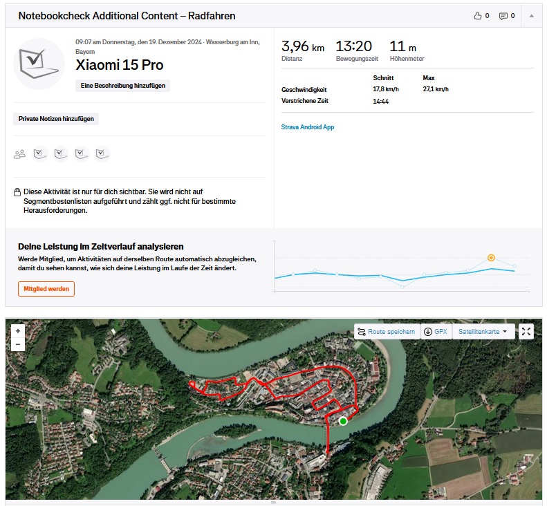 Die Positionsbestimmung in unserem Praxistest funktioniert mit dem Xiaomi-Handy sehr gut. Von einem Smartphone mit Dual-GNSS-Unterstützung hätten wir größere Abweichungen in unserem Streckenverlauf auch nicht erwartet. Die zurück gelegte Wegstrecke wird mit dem Xiaomi 15 Pro akkurat wiedergegeben. Die zu Vergleichszwecken genutzte Garmin Venu 2 liefert einen sehr ähnlichen Verlauf. Im Alltag ist die gebotene Genauigkeit des Xiaomi-Handys für Navigationsaufgaben mehr als ausreichend.