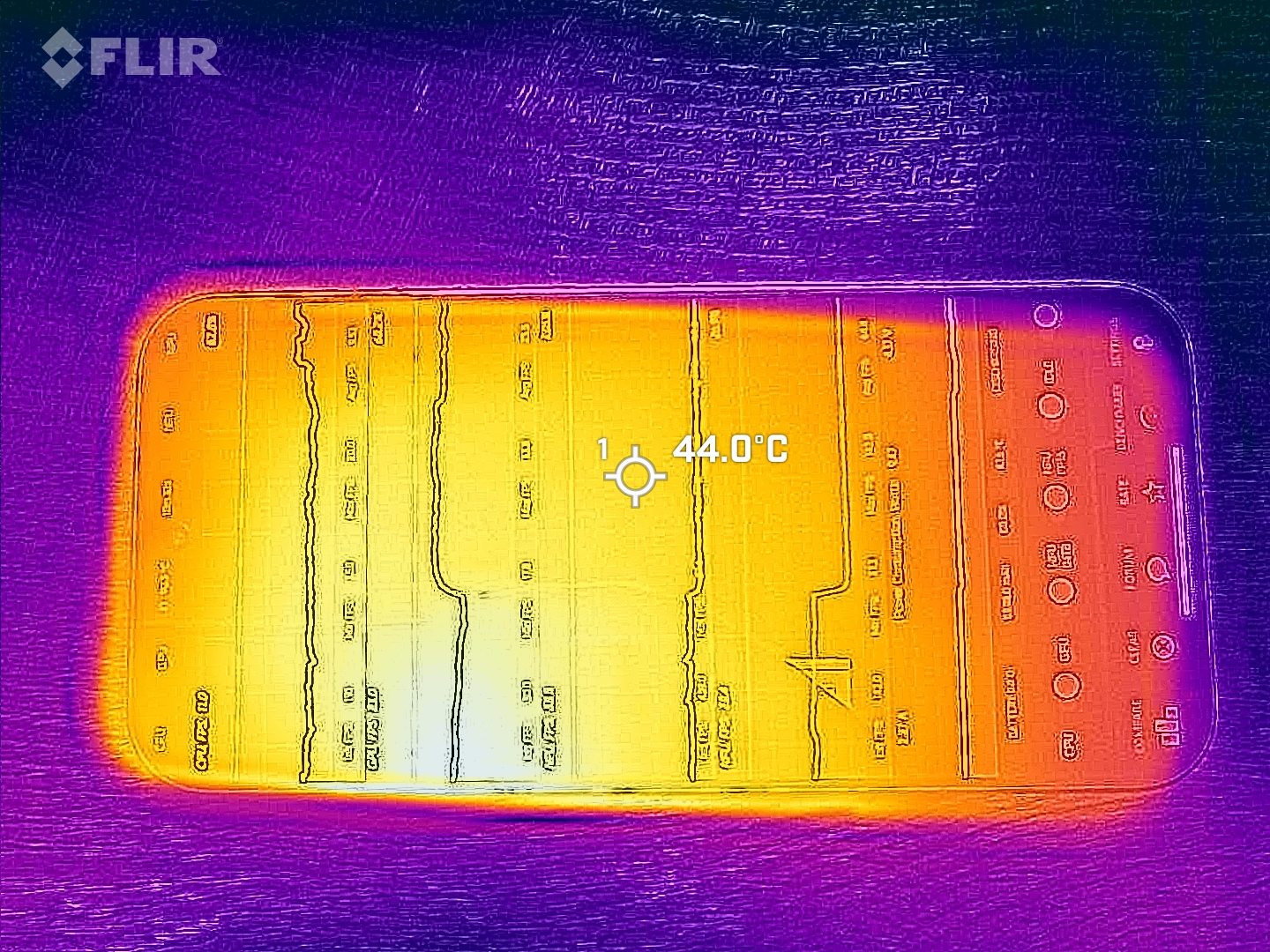 (-) Auf der Unterseite messen wir eine maximalen Wert von 46.8 °C (im Vergleich zum Durchschnitt von 34 °C).