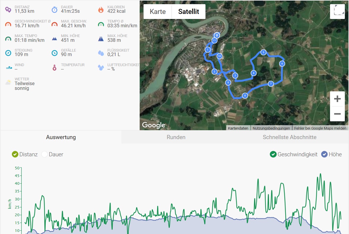 Um die Ortungsgenauigkeit unseres Testgerätes in der Praxis einschätzen zu können, zeichnen wir parallel eine Strecke zu Vergleichszwecken mit dem GPS-Fahrradcomputer Garmin Edge 520 auf. Nur 80 Meter liegen zwischen dem Smartphone-GPS-Modul und dem Profi-Navigationsgerät am Ende der 11,5 Kilometer langen Teststrecke. Die Streckenabweichungen sind gering und wird der Detailverlauf der GPS-Aufzeichnung betrachtet, ist das Black Shark 3 Pro aufgrund der überzeugenden Ortungsgenauigkeit und des großen Displays ideal für die Navigation im Auto geeignet. Die Positionsbestimmung mittels der Hauptsatellitensysteme GPS, GLONASS, Beidou sowie QZSS erfolgt sehr zügig – selbst in Gebäuden - mit einer Genauigkeit von 3 Metern.
