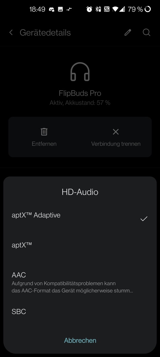 Im Test verwenden wir den AAC-Standard. Musik von Streamingdiensten wird unter Verwendung des aptX Adaptive – zumindest mit unseren FlipBuds Pro – mit einem deutlich wahrnehmbaren Knistern begleitet, was recht störend ist. Mit aptX oder AAC treten diese Probleme aber nicht auf.