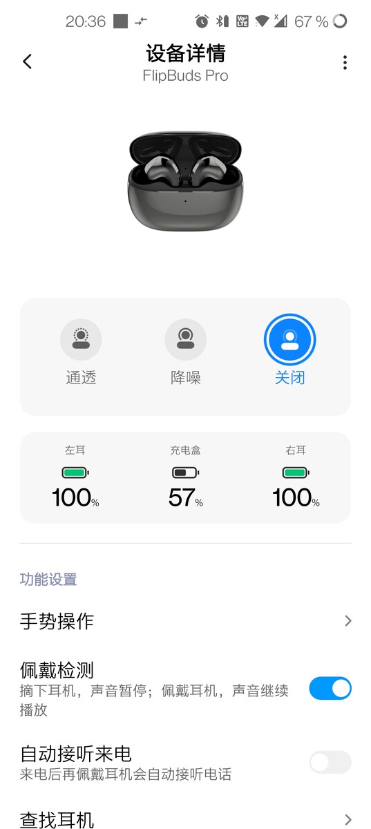Zum Wechseln der drei Modi wird grundsätzlich keine App benötigt, stattdessen können benutzerdefinierte Gesten genutzt werden. Anders als die Mi Air 2 Pro unterstützen die FlipBuds Pro keine Tippgesten, sondern werden vielmehr an den beiden Außenflächen des unteren Gehäusebereiches zusammengedrückt, was sehr gut funktioniert und weniger anfällig ist für Fehleingaben. Das Umschalten über die Kopfhörer ist ebenfalls weniger langwierig und auch die Rückmeldung der In-Ears ist nun durch verschiedene Töne, anstatt auf Chinesisch, untersetzt.