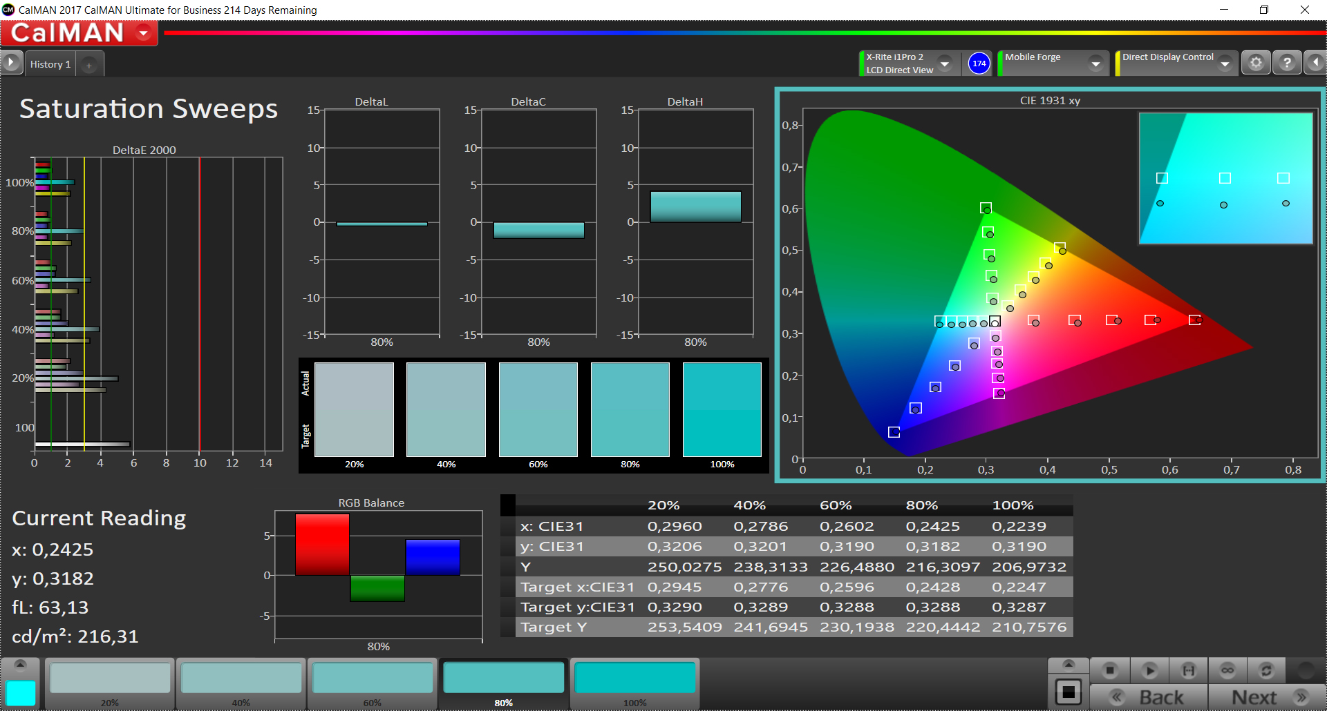 In den Display-Optionen lassen sich verschiedene Einstellungen für die Farbdarstellung aktivieren, die wir mit der Software CalMAN und dem Spektralfotometer unter die Lupe genommen haben. Für die Farben stehen die Modi „Default“, „Warm“ und „Cool“ zur Auswahl, für den Kontrast „Automatic Contrast“, „Increased Contrast“ und „Standard“. Die beste Farbdarstellung bekommt man mit der Kombination „Default“ und „Standard“. Dann sind die Farbabweichungen laut CalMAN am niedrigsten und liegen mit einem Delta-E-Wert von 2,4 sogar im Idealbereich (Delta-E < 3).