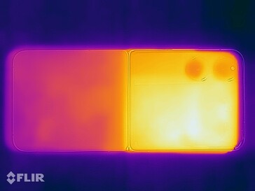 Die Oberflächentemperaturen des Gehäuses bekommt das Kühlsystem des kleinen Foldables im Alltag gut in den Griff, bei unserem Burnout-Benchmark messen wir allerdings eine ausgeprägte Abwärme von über 46 Grad im Bereich der Kameras. Die Abwärme führt in den Wild Life Stress Tests des 3DMark auch zu einer moderaten bis hohen Drosslung der Systemleistung von etwa 30 bis 45 Prozent.