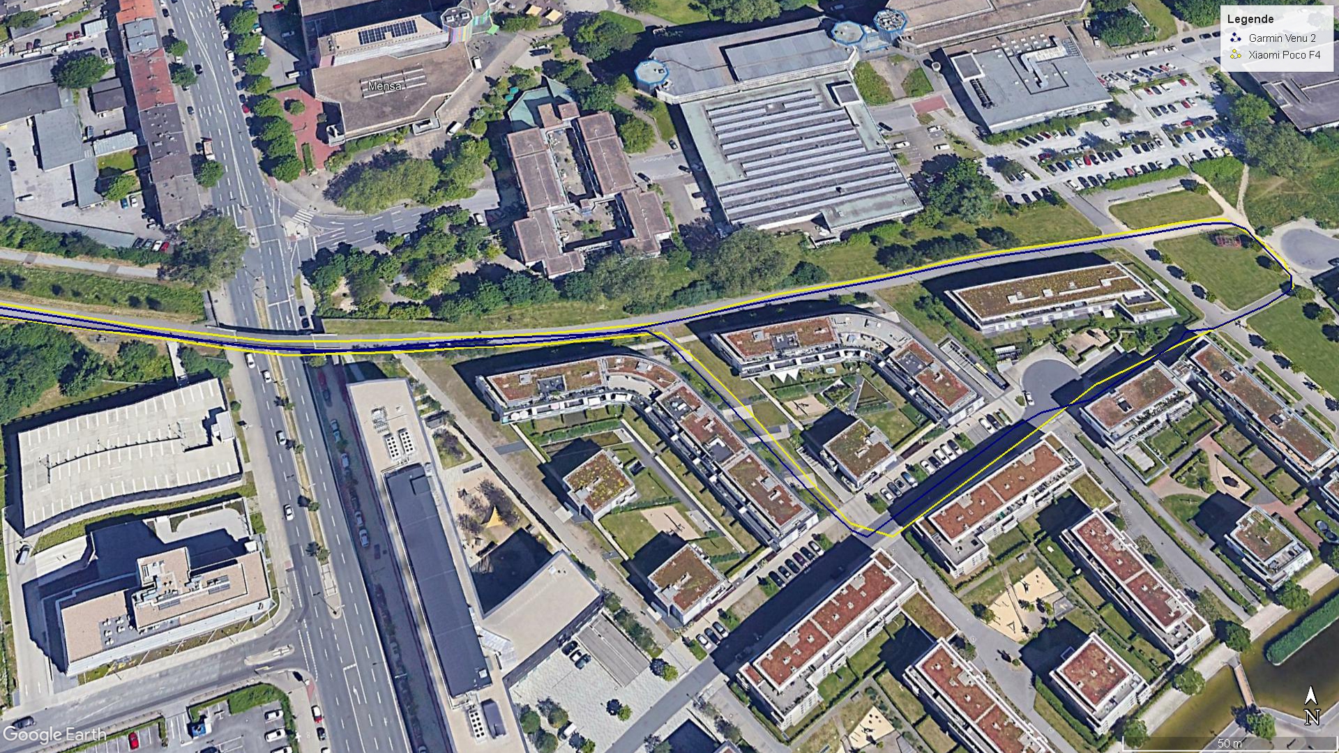 Bei einer Fahrrad-Vergleichsfahrt mit unserem Referenzgerät, der Garmin Venu 2, überzeugt das Poco F4 mit einer guten Darstellung der gefahrenen Route. Die aufgezeichnete Gesamtstrecke weicht kaum ab und die aufgezeichnete Strecke stimmt mit der Sattelitendarstellung überein, auch bei Abbiegungen und Kurven.