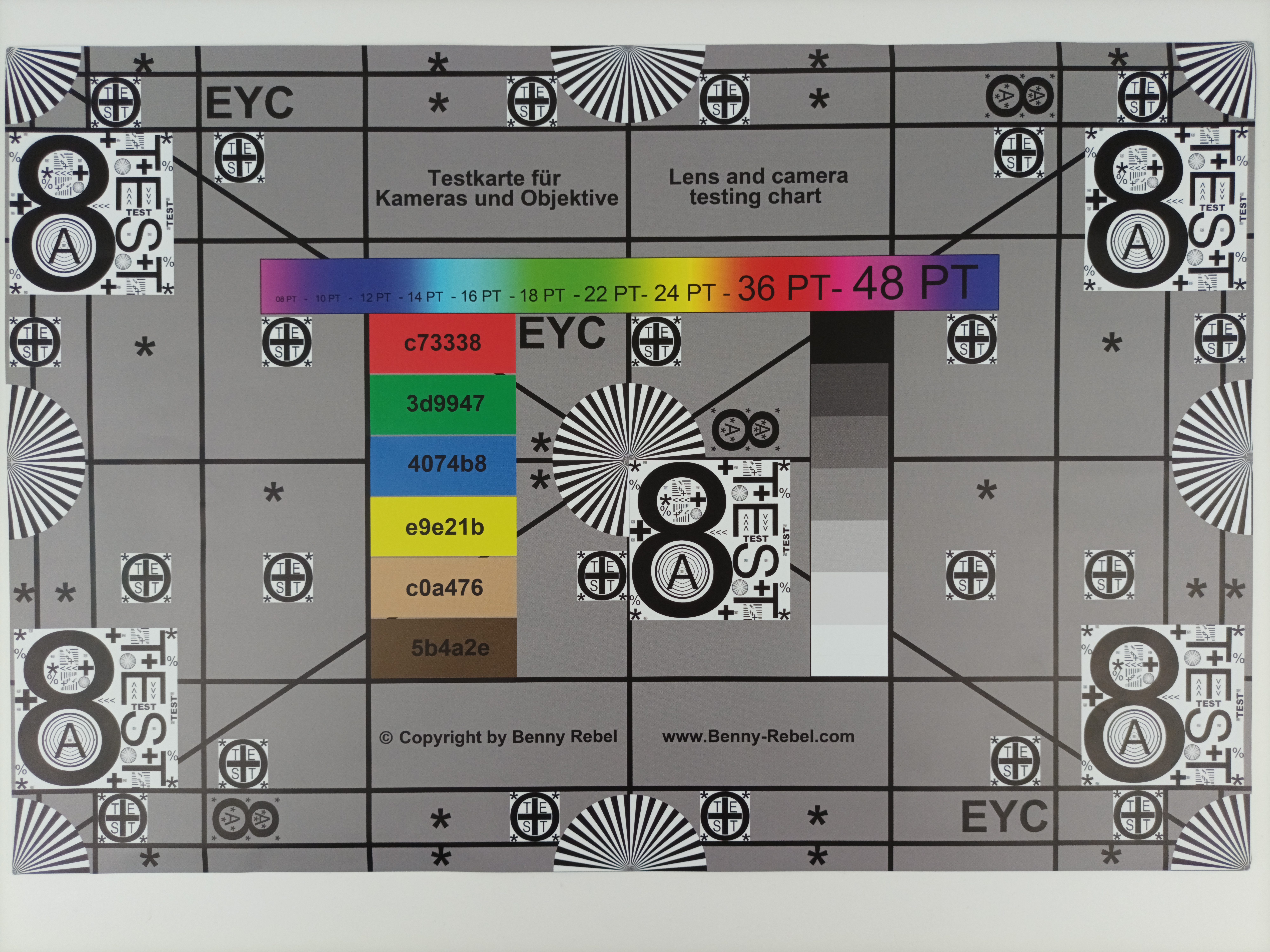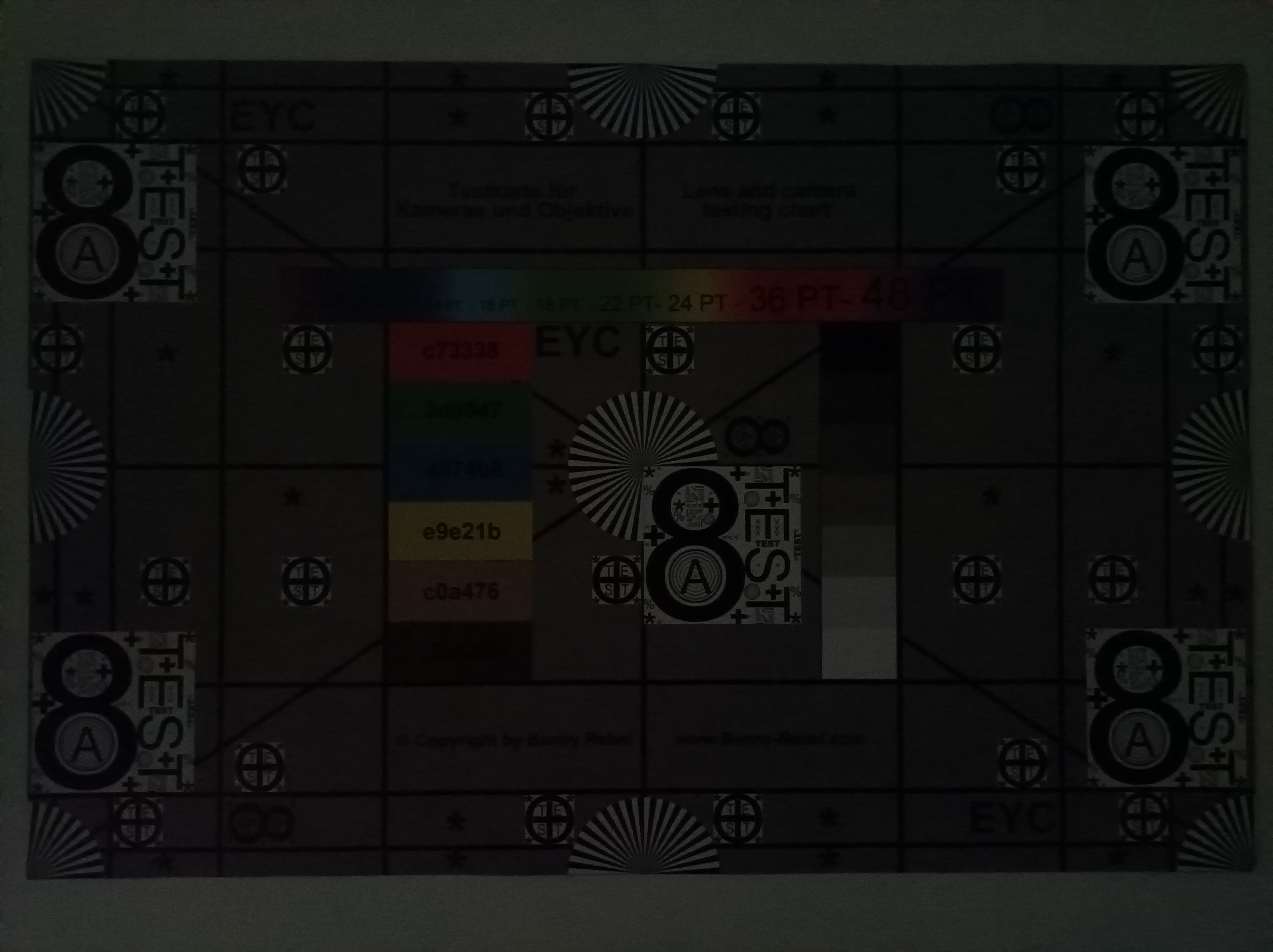 Tageslicht-Szene 1Tageslicht-Szene 25-facher ZoomLowlight-AufnahmeUnter Laborbedingungen kommt das Poco M3 Pro 5G bei simuliertem Tageslicht (obere Farbkarte) ziemlich nahe an die Referenzfarben heran und bildet den Testchart scharf ab. Bei 1 Lux Helligkeit (untere Farbkarte) sind die Farbabweichungen dagegen sehr groß und der Testchart wird nur noch dunkel und verwaschen abgelichtet.