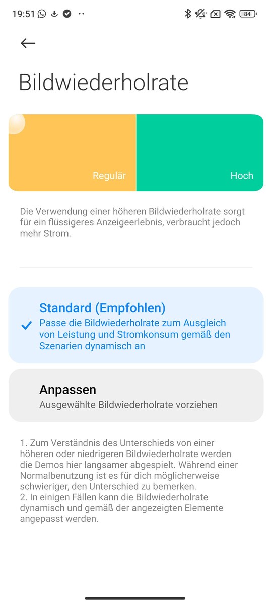 Xiaomi verbaut im Poco M6 Pro ein 6,67 Zoll großes AMOLED-Panel. Anders als beim M5 beherrscht es sogar eine Bildwiederholrate von 120 Hz. Die Rate kann bei 60 oder 120 Hz fixiert werden, ab Werk darf die Software die Anpassung übernehmen. Laut DRM-Info sind mögliche Stufen bei 60, 90 und 120 Hz.