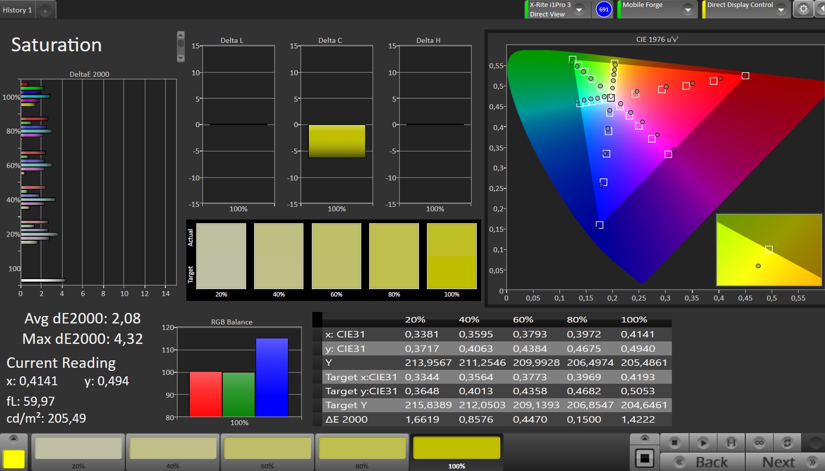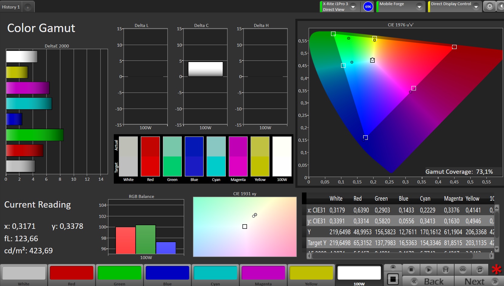 In unseren Messungen mit dem Spektralfotometer und der Software CalMAN sehen wir einen minimalen Gelbstich bei den Weißtönen, der sich tatsächlich als die größte Abweichung zum Referenz-Farbraum erweist. Farben werden generell sehr gut dargestellt, am exaktesten ist das Farbprofil "Standard".