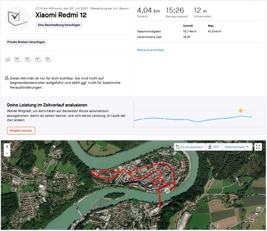 Solange die Straßen relativ breit und die Häuser niedrig sind, hat das Redmi 12 keine Probleme, den gefahrenen Weg exakt nachzuvollziehen. In engen Altstadtgassen leidet die Genauigkeit etwas, ist aber immer noch gut. Somit können wir das Redmi 12 auch zu Navigationszwecken empfehlen.