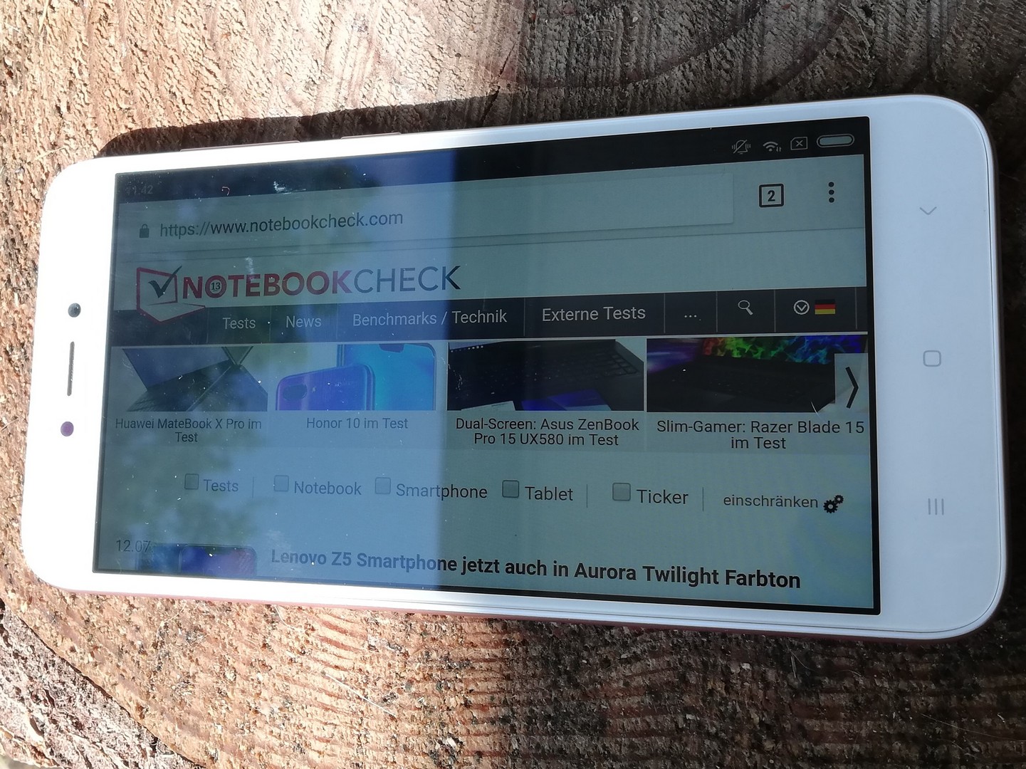 Im Freien sollte das Redmi 5A bevorzugt an schattigen Plätzen verwendet werden. Die Helligkeit reicht zwar aus, um Displayinhalte gut lesbar darstellen zu können, die Reflexionen der Umgebung auf dem Bildschirm erschweren die Sicht allerdings enorm.