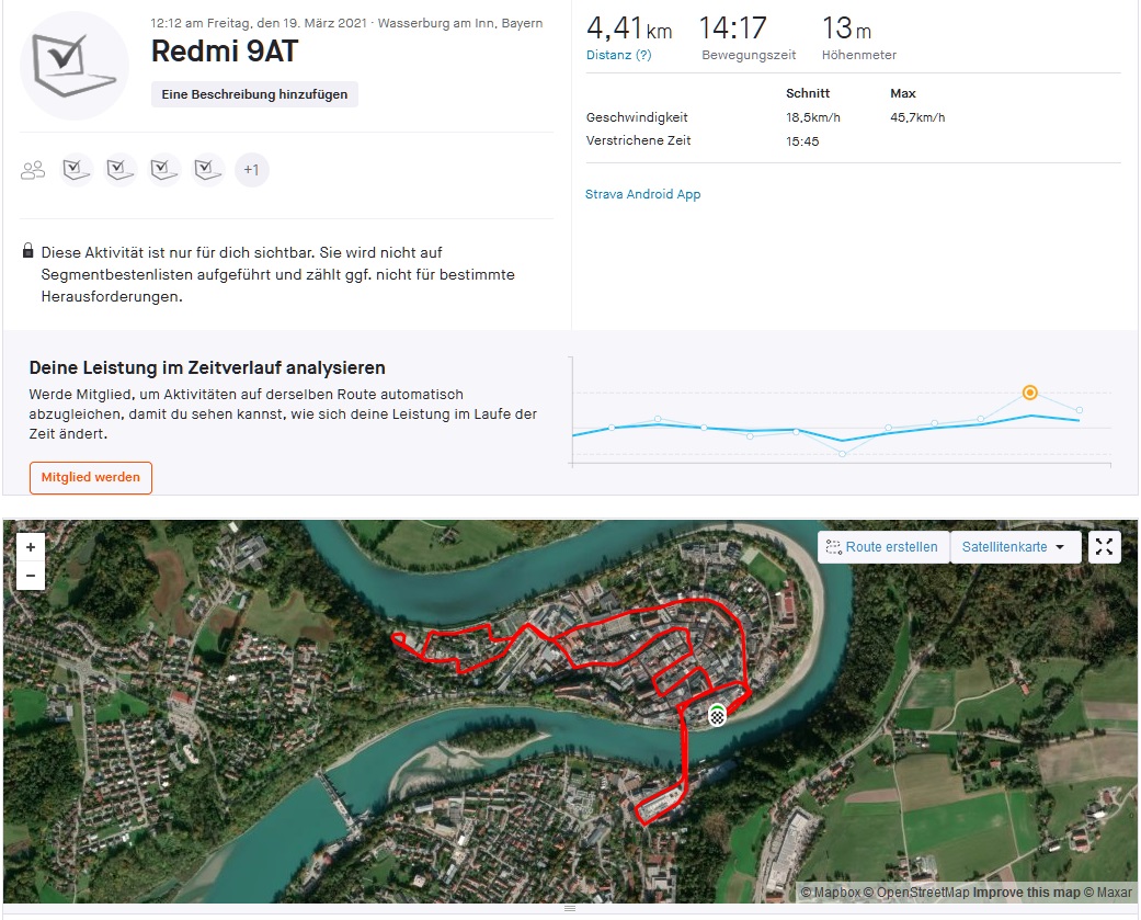 Um die Ortungsgenauigkeit des Redmi 9AT in der Praxis einschätzen zu können, zeichnen wir parallel eine Strecke zu Vergleichszwecken mit dem GPS-Fahrradcomputer Garmin Edge 520 auf. Die Abweichungen belaufen sich in Summe auf nur 80 Meter am Ende der 4,5 km langen Wegstrecke. Auch der Detailverlauf bescheinigt dem Redmi-Handy gute Navigationsfähigkeiten.