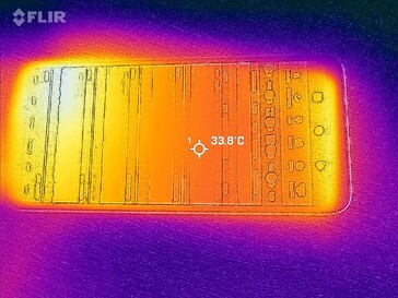 (+) Die maximale Temperatur auf der Oberseite ist 38.8 °C. Im Vergleich liegt der Klassendurchschnitt bei 35.2 °C (von 21.9 bis 247 °C für die Klasse Smartphone).