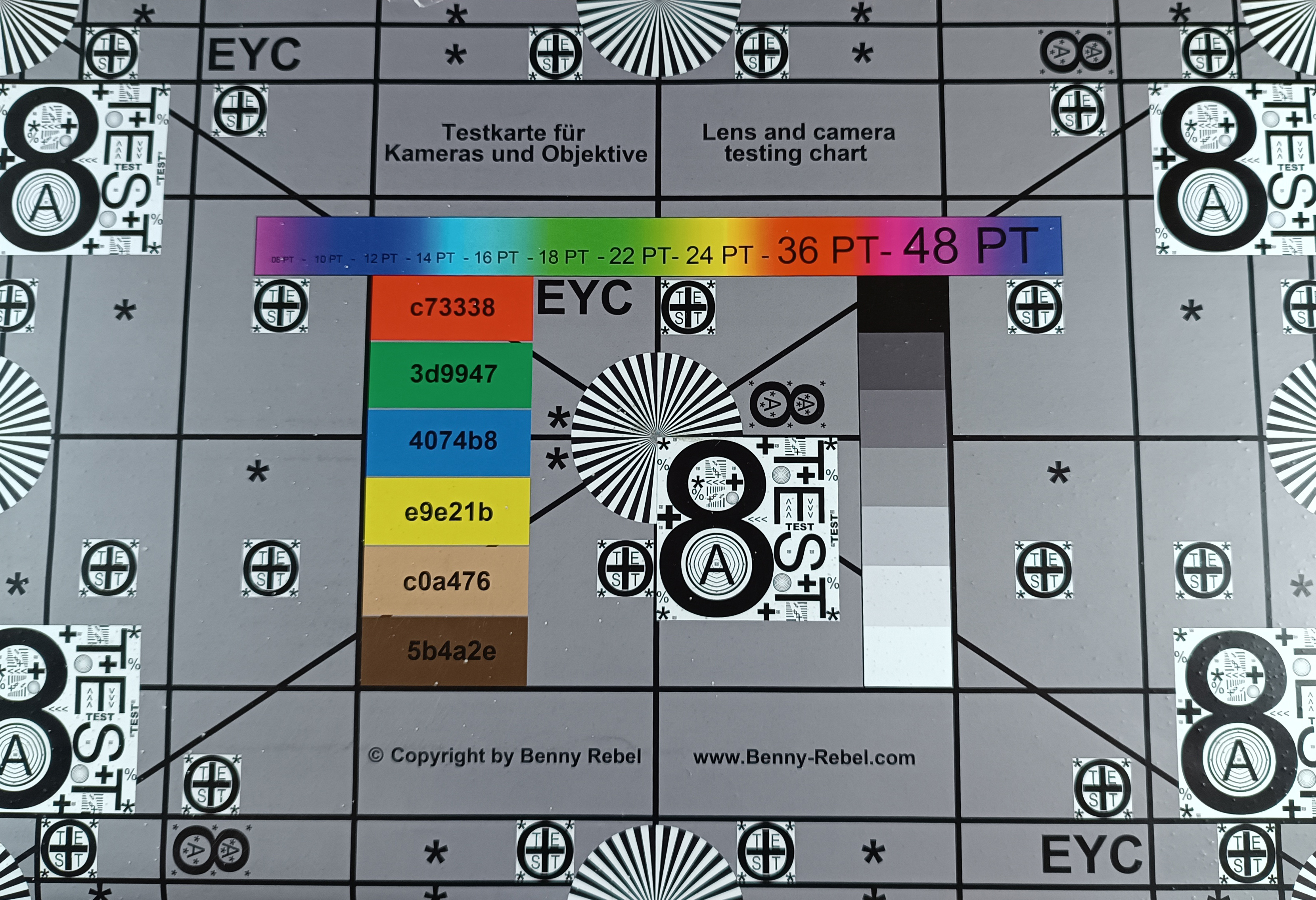 Hauptkamera BlumeHauptkamera UmgebungHauptkamera LowLightWeitwinkelDie Hauptkamera von Samsung muss sich auch noch im Testlabor bewähren, hier haben wir ein Testchart aufgebaut, das wir einmal bei voller Studiobeleuchtung ablichten. Die Schärfe nimmt hier an den Rändern des Bildes deutlich ab und auch schwarzer Text vor rotem Hintergrund stellt die Kamera vor Schärfeprobleme.