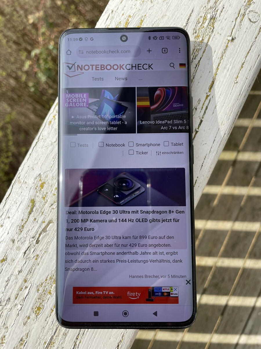 Bei reinweißem Hintergrund bringt es das AMOLED-Panel auf eine mittlere Helligkeit von 1233 cd/m² und leuchtet damit für seine Preisklasse überdurchschnittlich hell. Es kann aber noch mehr. Bei gleichmäßig verteilten hellen und dunklen Bildbereichen (APL18-Messung) steigt seine maximale Luminanz auf 1714 cd/m² und kommt damit der Herstellerangabe von 1800 Nits schon ziemlich nahe. Bei HDR-Inhalten können wir dem Display allerdings nicht mehr als 1178 cd/m² entlocken. In der niedrigsten Helligkeitsstufe leuchtet es noch mit 2,36 cd/m².