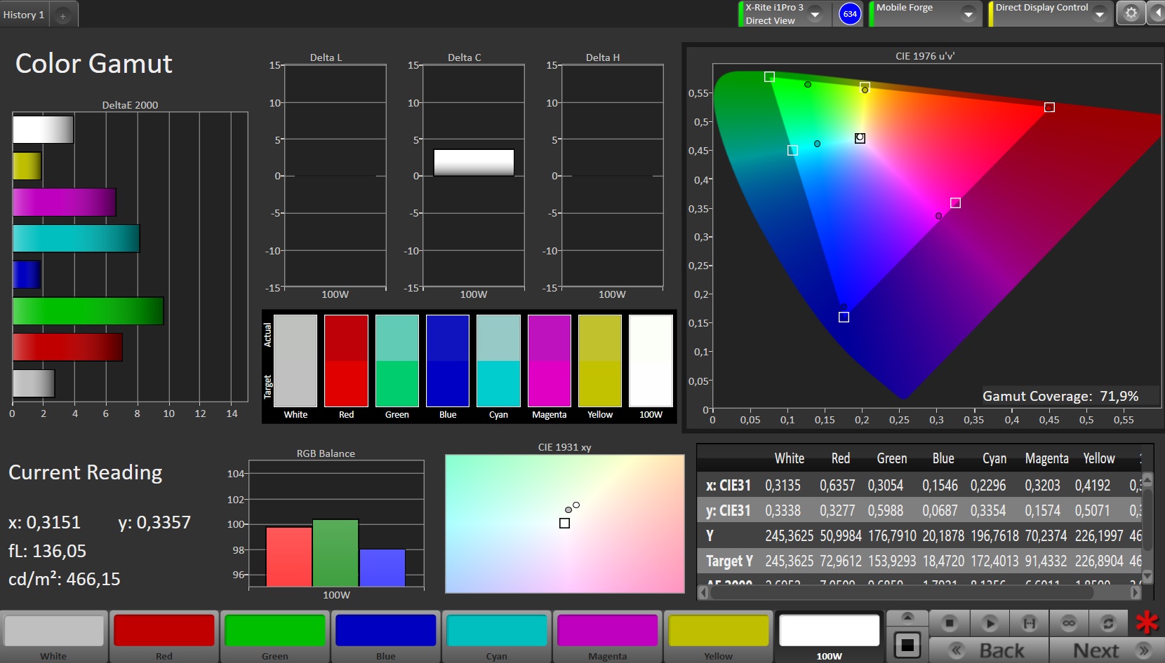 | Colorchecker dE 2000 max. * | 4.07 | 1.6 61% | 4.34 -7% | 1.7 58% | 2.7 34% |