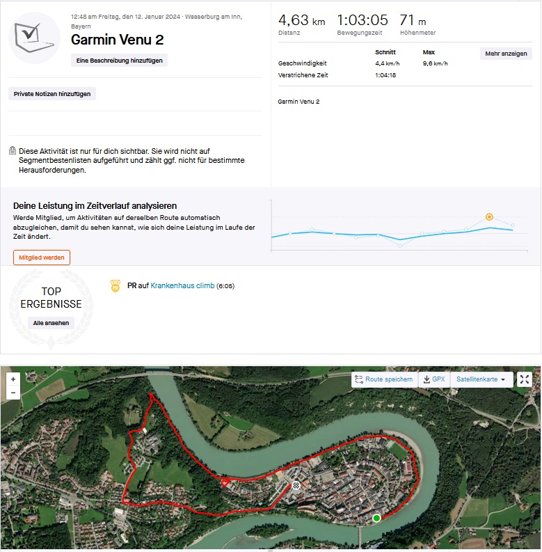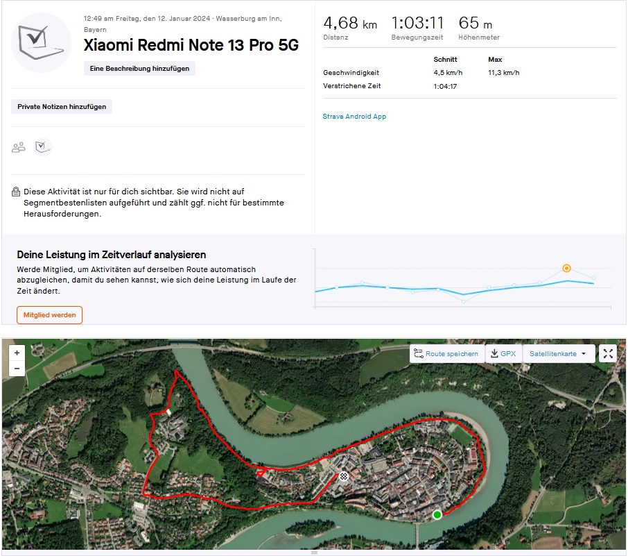 Im Praxistest wollen wir herausfinden, wie exakt das Xiaomi Redmi Note 13 Pro 5G seine Position bestimmen kann, vor allem auch in Bewegung. Dazu sind wir diesmal aufgrund der eisglatten Straßen ausnahmsweise zu Fuß unterwegs. Als Vergleichsgerät haben wir die Smartwatch Garmin Venu 2 dabei, welche ihre guten Ortungsfähigkeiten bereits oft bewiesen hat.