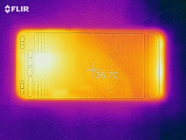 Im Zuge unserer Messungen bei laufendem Betrieb klettert die Gehäusetemperatur nicht über 34 Grad. Auch unter permanenter Last, wie sie der GFX-Akkutest simuliert, kann der Snapdragon 660 die Bildrate auf einem annähernd gleichbleibenden Niveau halten.