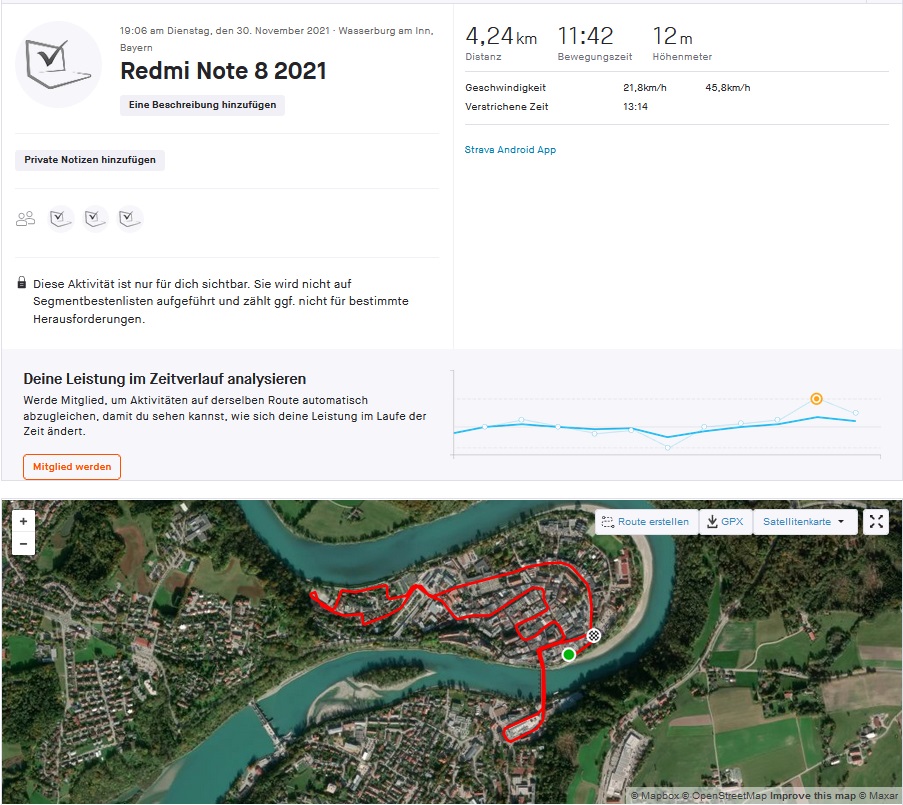 Die Ortungsfähigkeiten des Note 8 2021 sind nicht immer perfekt, Abweichungen in der Detailansicht der GPS-Aufzeichnung sind allerdings gering, sodass sich kaum nennenswerte Ungenauigkeiten im Streckenverlauf ergeben.