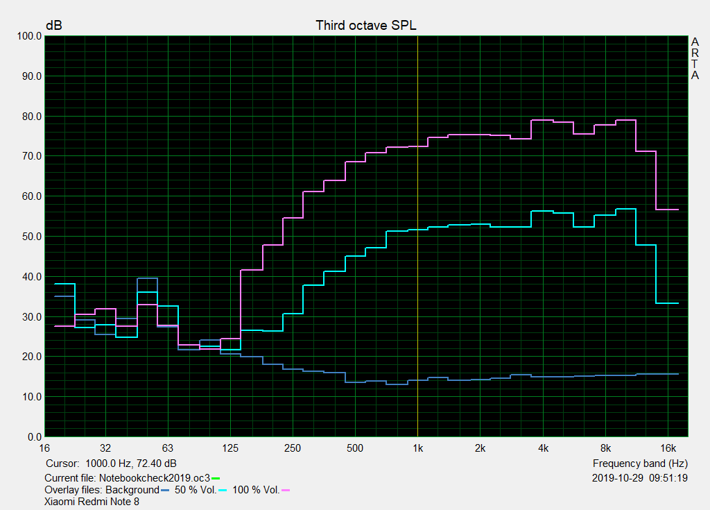 Das Note 8 soll laut Xiaomi einen ultra-linearen Lautsprecher besitzen. Und in der Tat, die Audioausgabe liefert einen schönen Klang und ein lineares Klangbild sowie eine hohe maximale Lautstärke von fast 88 dB(A). Da ein 3,5-Millimeter-Klinkenanschluss vorhanden ist, können „normale“ Kopfhörer ohne Adapter weiterhin verwendet werden. Die Ausgabe ist sauber und Xiaomi-typisch ansprechend laut.
