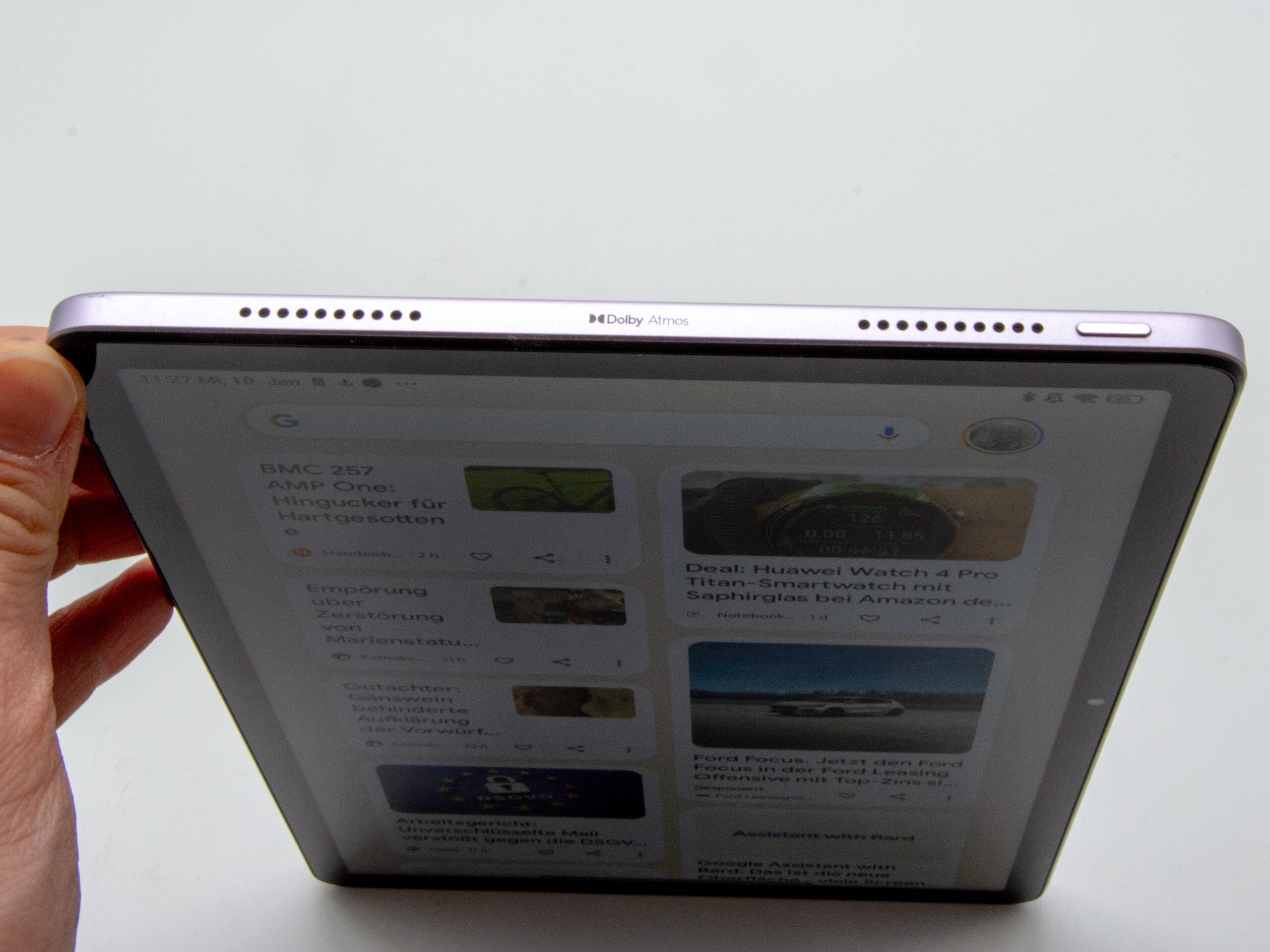 Die vier Lautsprecher sitzen an den kurzen Seiten des Tablets. Erfreulich ist, dass das Redmi Pad SE einen Klinkenanschluss auf der Unterseite hat, den hatten wir beim Vorgänger, dem Redmi Pad, vergeblich gesucht. Die Displayränder sind zwar nicht so dünn wie bei High-End-Tablets wie dem Samsung Galaxy Tab S9, aber auch nicht wirklich dick. Zudem sind sie schön gleichmäßig.