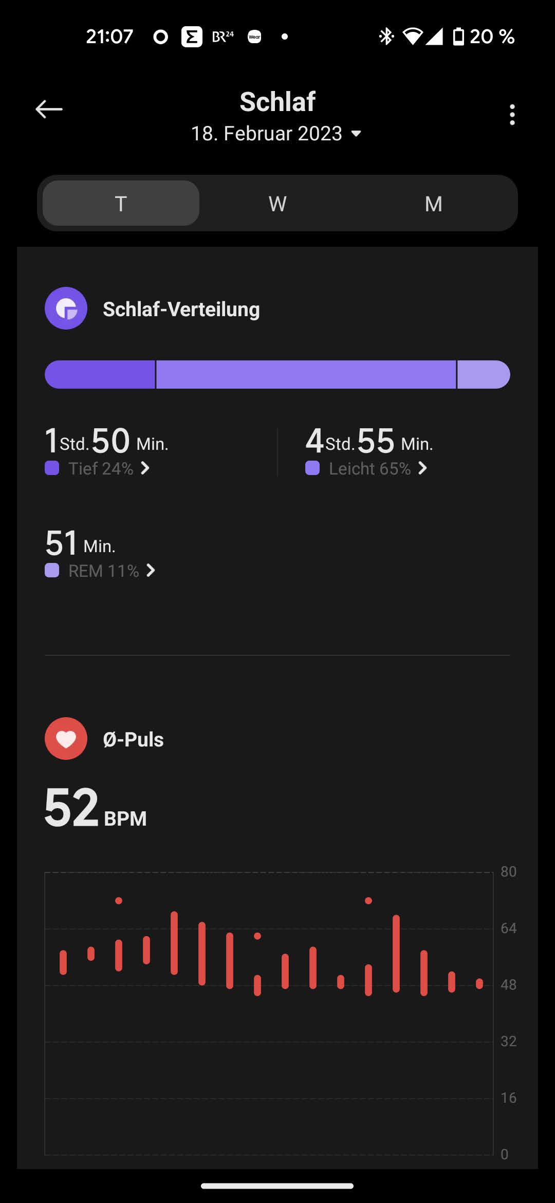 Generell erkennt die Smartwatch Schlaf- und Wachphasen zuverlässig, auch Nickerchen werden erkannt. Die Uhr erkennt Tiefschlaf, leichten Schlaf und REM Schlaf und schlüsselt die Gesamtschlafzeit in die einzelnen Phasen auf. Die Werte werden auch grafisch dargestellt. Sie können für eine Nacht, aber auch für eine Woche oder einen Monat ausgegeben werden.