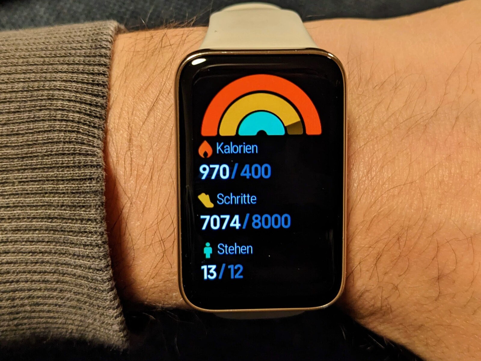 Das Smart Band 7 Pro bietet die bekannten Kreise bzw. Halbkreise zur Darstellung der Ziele für den Tag. Dabei gibt Xiaomi Werte für verbrannte Kalorien in Aktivität, absolvierte Schritte und Stunden, in denen gestanden wurde, an.