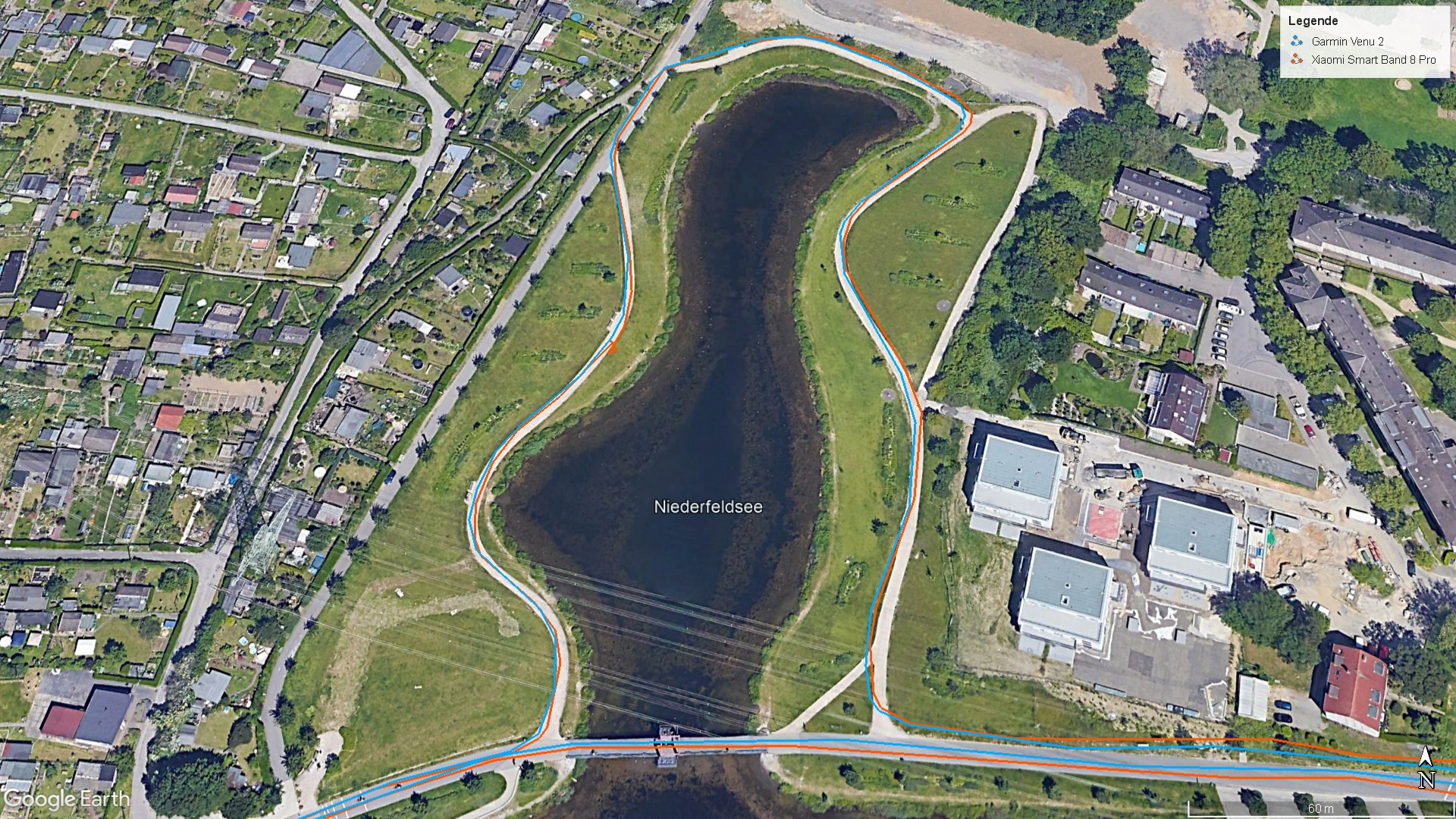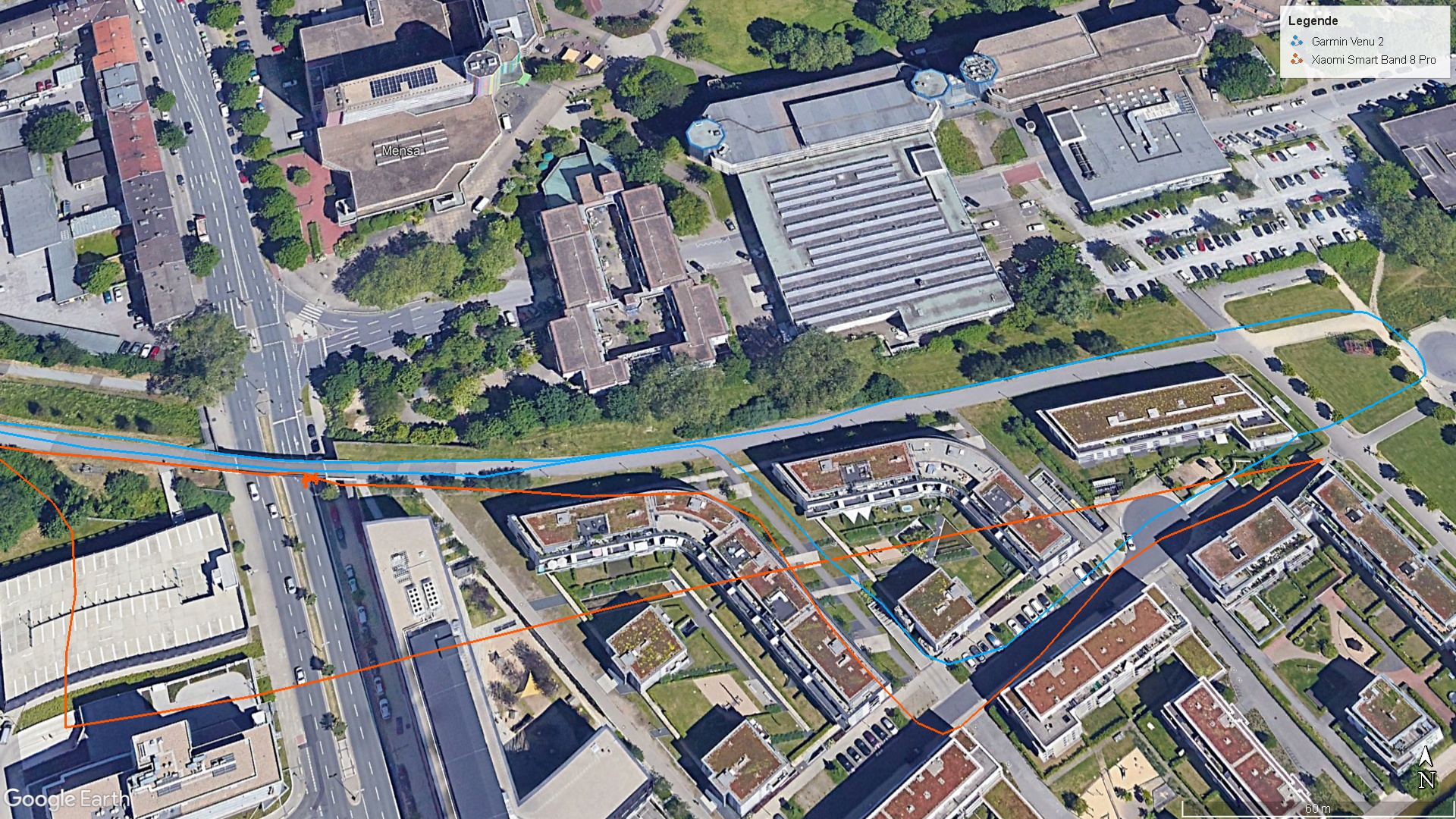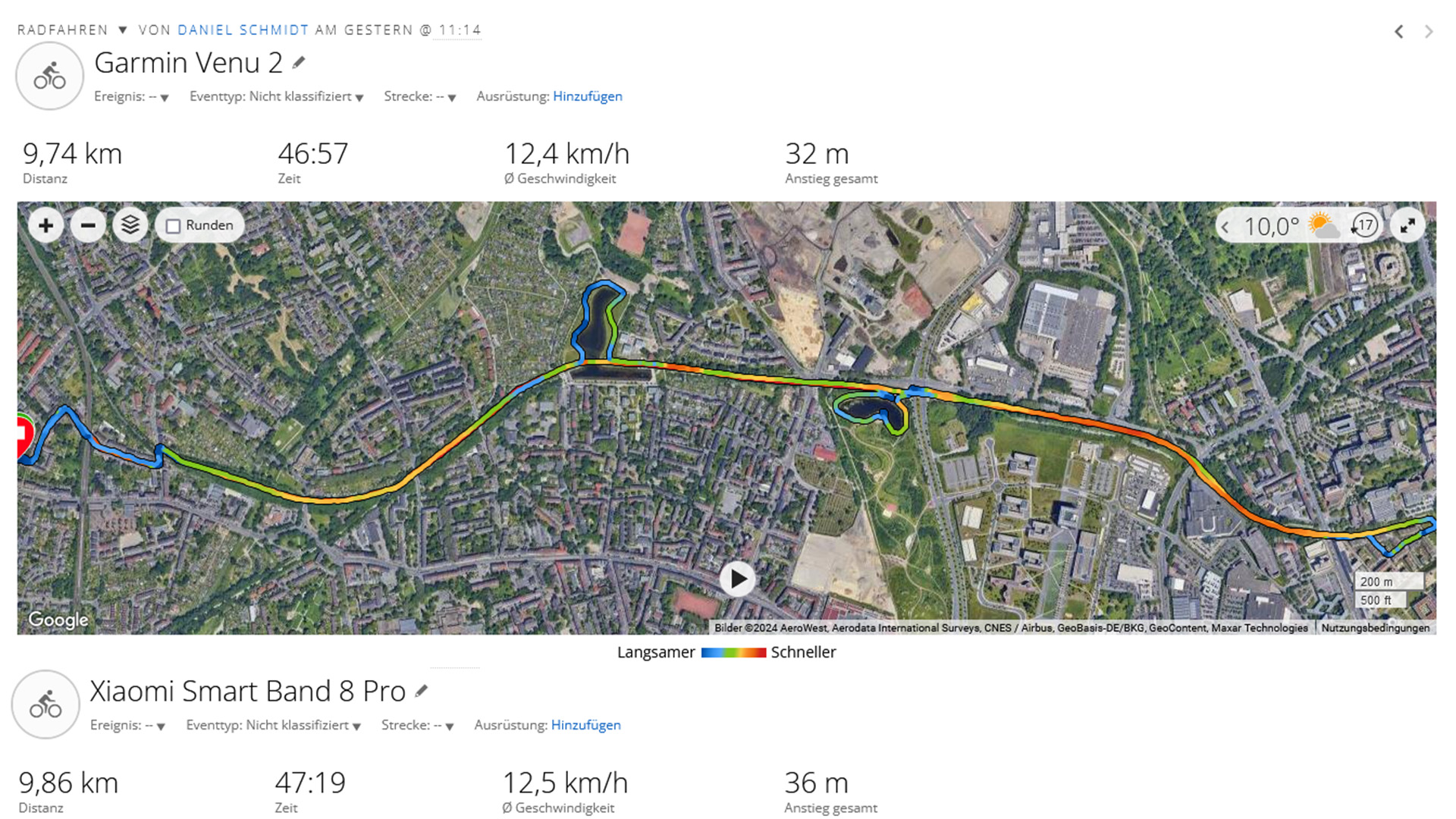 Wir haben das Smart Band 8 Pro zusammen mit einer Garmin Venu 2 auf eine Radtour genommen. Dabei wird deutlich, dass das Smart Band 8 Pro gerade in bebauten Bereichen Probleme mit der Lokalisierung hat. Der aufgezeichnete Track stimmt nicht mit den Wegen überein.