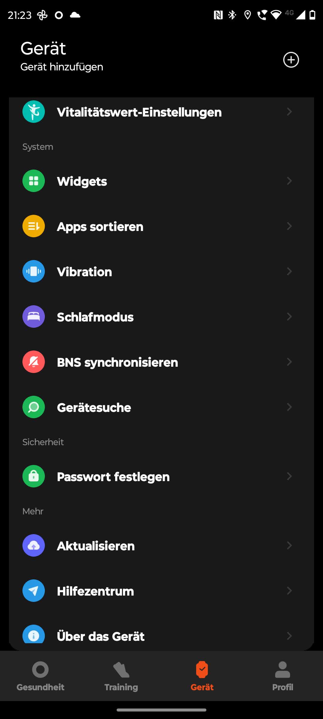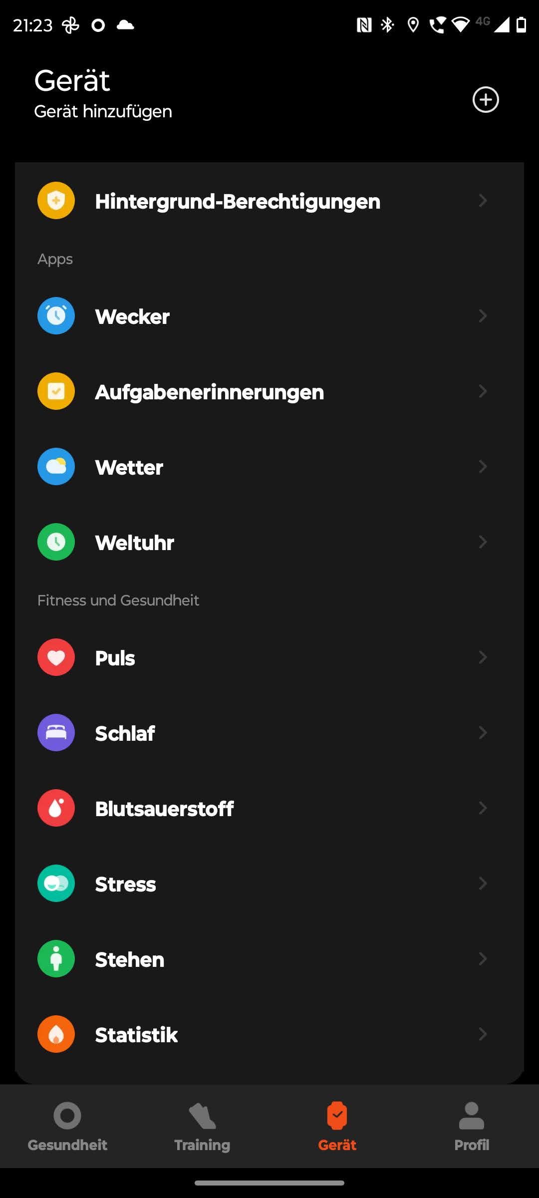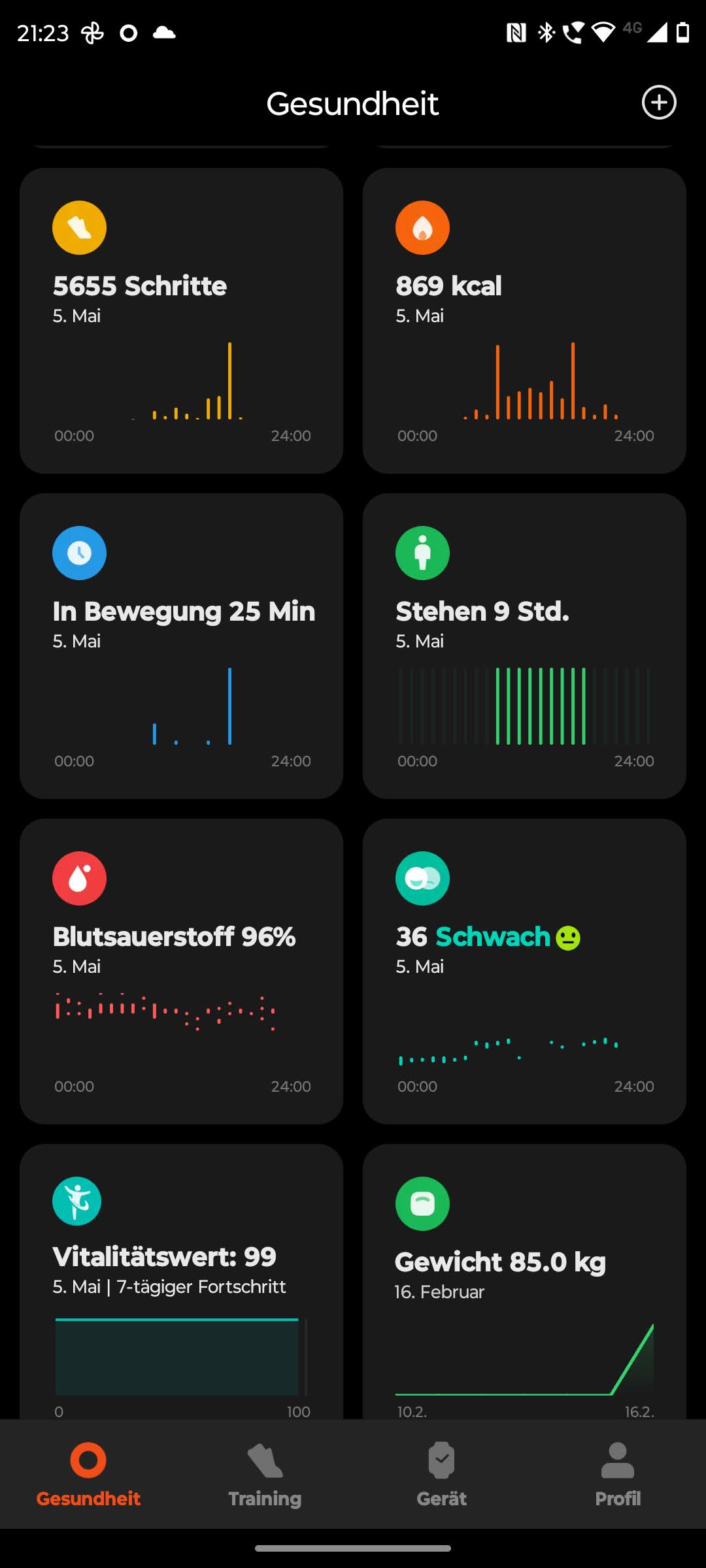 Die Smartphone-App ist in vier Bereiche unterteilt: "Gesundheit", "Training", "Gerät" und "Profil". "Gesundheit" fungiert als Dashboard mit Zugriff auf alle Körperwerte, die erfasst werden. Diese werden nach Themen geordnet als Kacheln dargestellt. Ein Blick auf die Kacheln öffnet ein Untermenü mit mehr Infos.