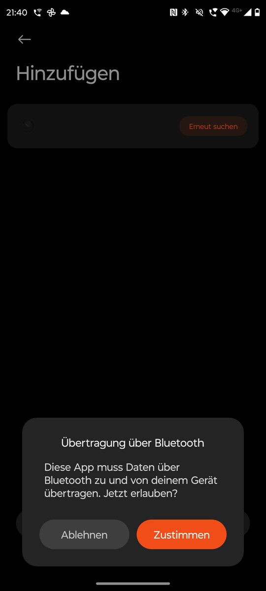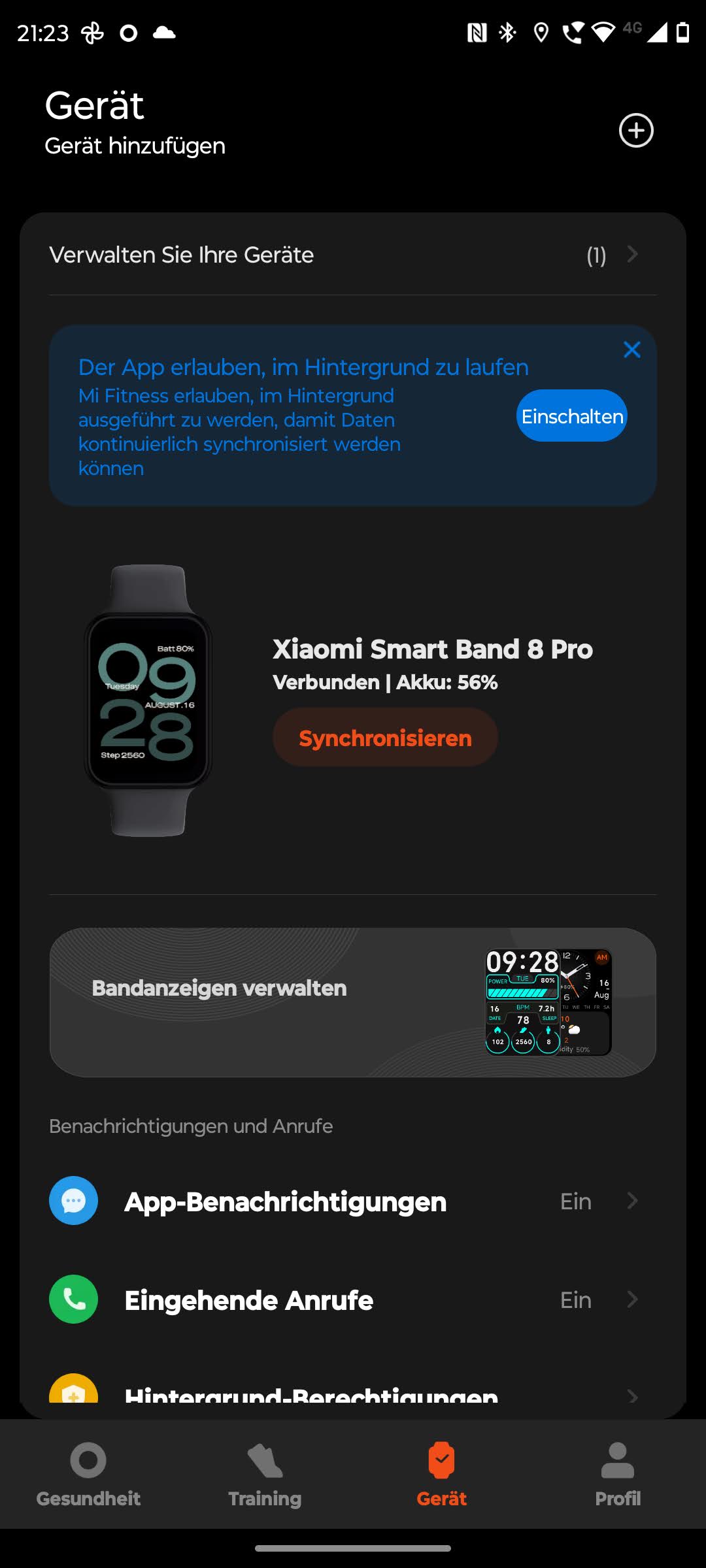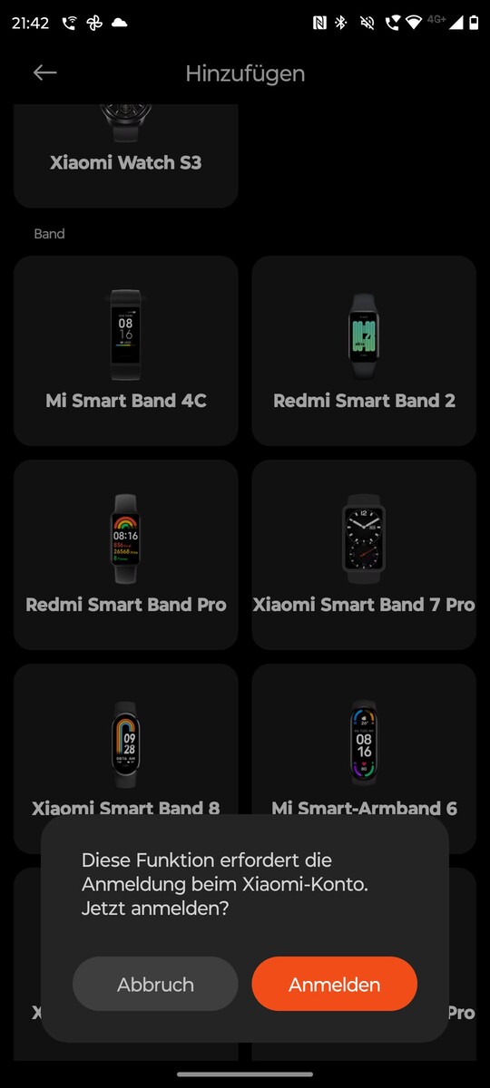 Für die Einrichtung und Bedienung des Trackers muss die Mi-Fitness-App installiert werden. Diese fordert nach der Installation und vor der Suche nach Geräten zur Anmeldung mit einem Xiaomi-Konto auf. Danach wird das Smart Band 8 Pro zügig gefunden und verbunden.